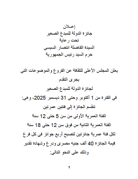 وأوضح محافظ أسيوط، أن آخر موعد للتسجيل في المسابقة 31 ديسمبر 2025، تحت إشراف وزارة الثقافة والمجلس الأعلى للثقافة، وعلى مستوى الجمهورية، وذلك للفئة العمرية من 5 سنوات وحتى 18 سنة، بهدف تنمية الوعي الثقافي والإبداعي لدى الأطفال والشباب وتحفيزهم على الابتكار، بما يتوافق مع رؤية مصر 2030 واستراتيجية بناء الإنسان المصري.