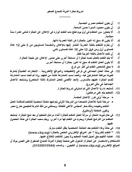 وأوضح محافظ أسيوط، أن من أبرز شروط التقدم للجائزة أن يكون المتقدم مصري الجنسية، محمود السيرة حسن السمعة، وألا يتجاوز سنه 18 عامًا في أول يوم لفتح باب التقدم، وألا يكون قد سبق له الفوز بالجائزة في الفئة العمرية ذاتها، مع الالتزام بالفئة العمرية المعلنة، وتقديم الأعمال باللغة العربية فقط، وعدم التقدم بالعمل نفسه لأي جائزة أو مسابقة أخرى، أو أن يكون قد سبق فوزه بجائزة سابقة.