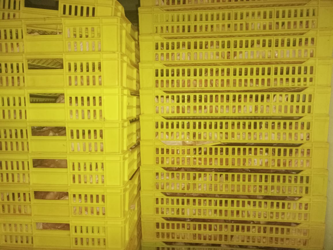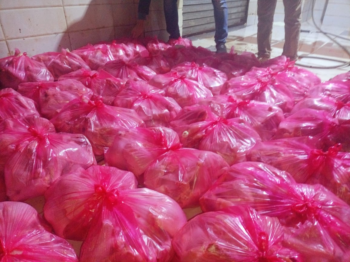 وبالفحص، تم ضبط كميات من أوراك وصدور وفيليه الدواجن غير المدون عليها أي بيانات، وبها سائل انفصالي مدمم، وذلك طبقًا لفحص السادة الأطباء البيطريين. وقد بلغ إجمالي المضبوطات (3110) كجم — ثلاثة أطنان ومائة وعشرة كيلوجرامات من أوراك وصدور وفيليه الدجاج.