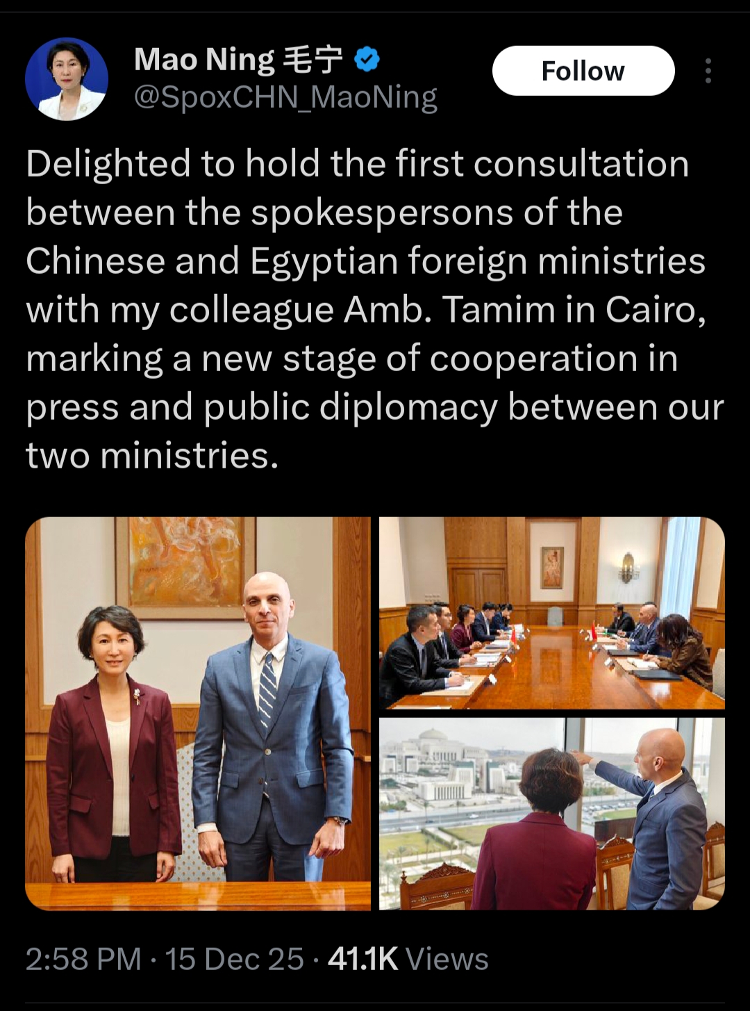عقدت ماو نينغ المتحدثة بإسم الخارجية الصينية اجتماع تشاوري مع السفير تميم خلاف المتحدث بإسم الخارجية المصرية ، والذى يعد الأول بين المتحدثين باسم وزارتي الخارجية الصينية والمصرية.