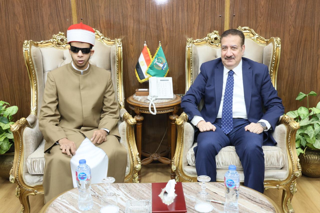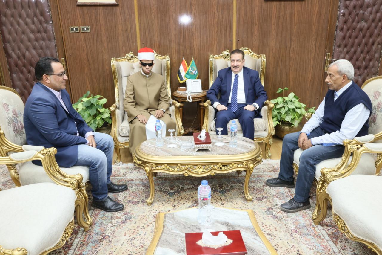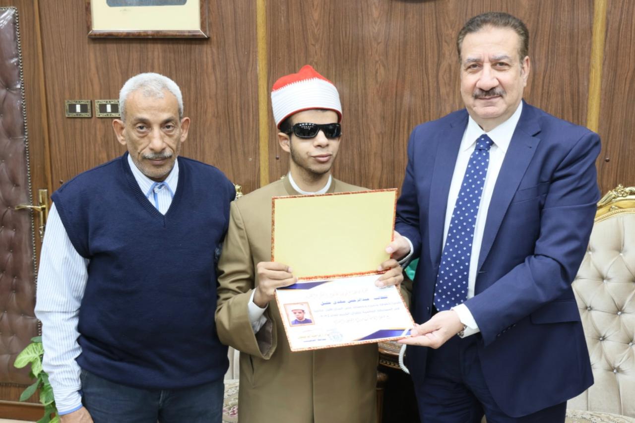 أهداه محافظ المنوفية مكافأة مالية وشهادة تقدير لتفوقه في واحدة من أعرق المسابقات القرآن الدولية، معرباً عن بالغ فخره واعتزازه بهذا التفوق الذى حققه رغم التحديات والصعوبات لفقدانه نعمة البصر، حيث يعد نموذجاً يحتذي به في العزيمة والإصرار ومؤكداً حرصه على دعمه الكامل لذوى الهمم وتقديم أوجه الرعاية المباشرة كونهم جزء أساسي وأصيل في المجتمع تنفيذاً لتوجيهات القيادة السياسية.