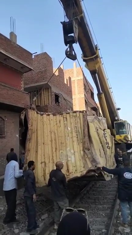 دفعت السكة الحديد بونش عملاق لرفع الحاويات الساقطة من قطار بضائع طوخ، والتي تسببت في بعض تلفيات واجهات المنازل بالمنطقة.