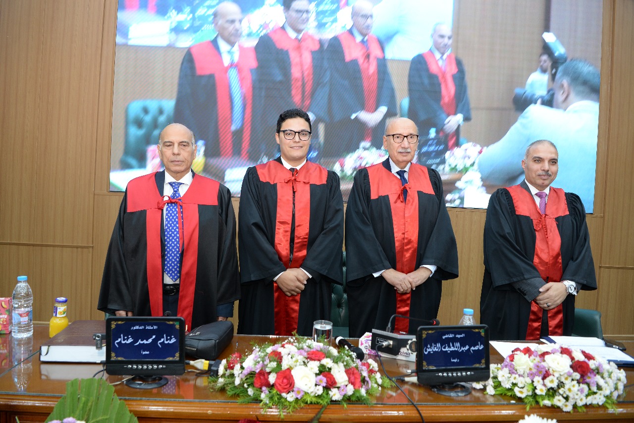 وضمت لجنة المناقشة، القاضي الغايش (رئيساً)، و كلً من الأستاذ الدكتور غنام محمد غنام (أستاذ القانون الجنائي وعميد الكلية الأسبق)، والأستاذ الدكتور تامر محمد صالح (أستاذ القانون الجنائي ووكيل الكلية، (مشرفاً).