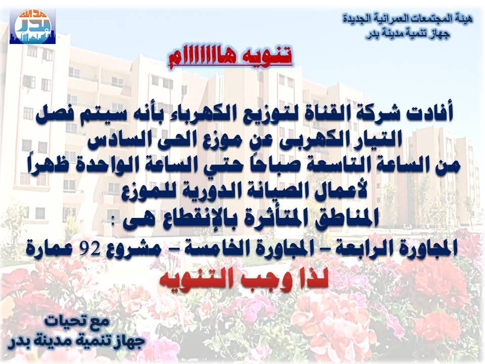 بالتنسيق بين جهاز تنمية مدينة بدر و شركة القناة لتوزيع الكهرباء سيتم فصل التيار الكهربائي بشكل مؤقت عن مغذي الحي السادس بمدينة بدر، وذلك يوم غد، اعتبارًا من الساعة التاسعة صباحًا وحتى الساعة الواحدة ظهرًا.