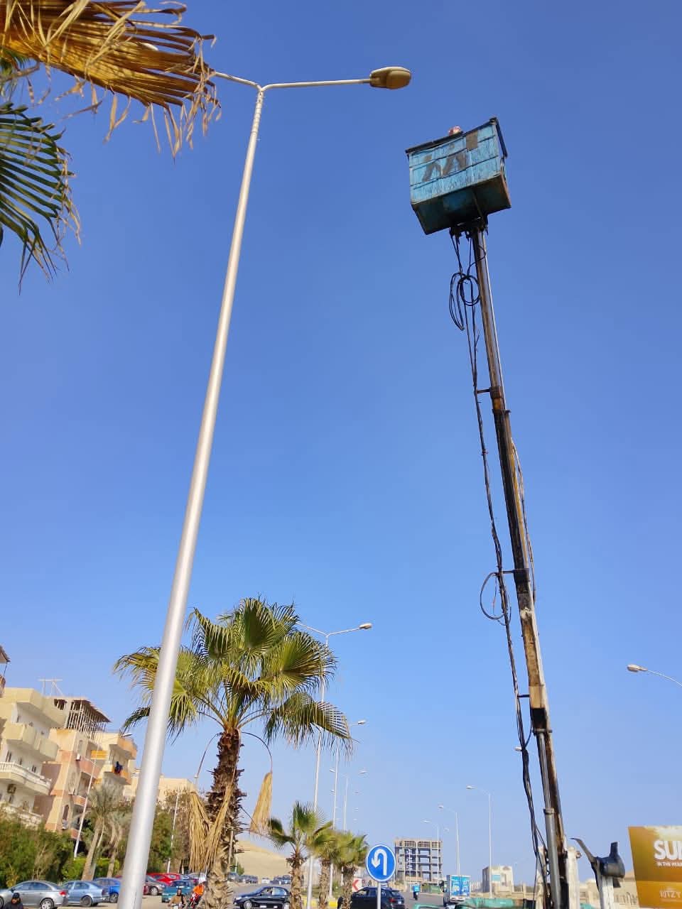 تتواصل أعمال استبدال كشافات الصوديوم القديمة بكشافات LED الحديثة بأعمدة الإنارة بعدد من المحاور والطرق الرئيسية بمدينة الشيخ زايد.
