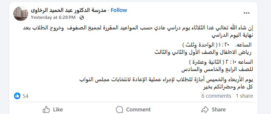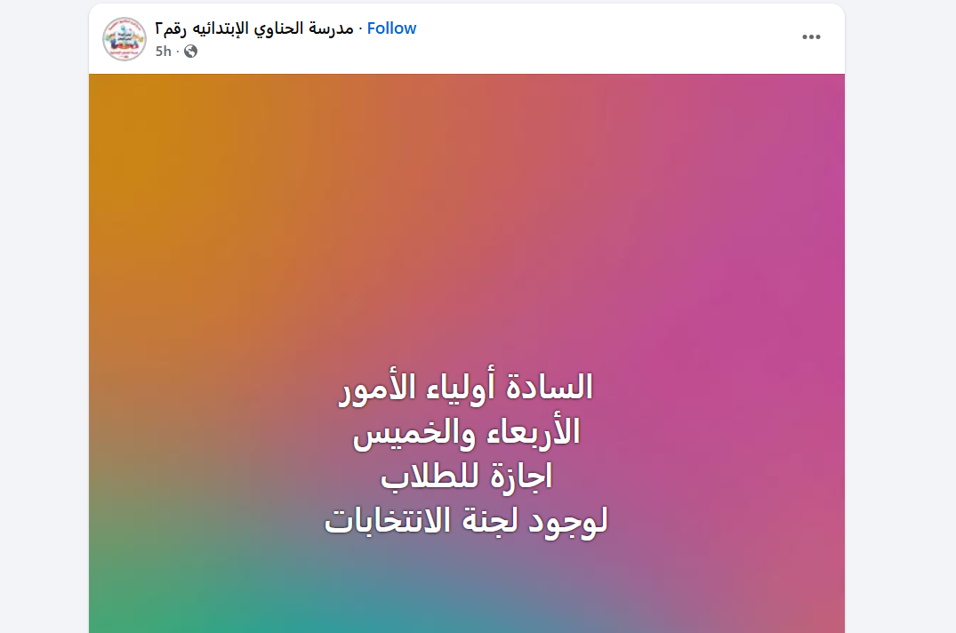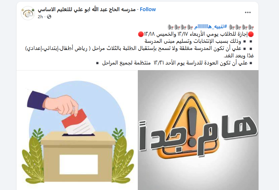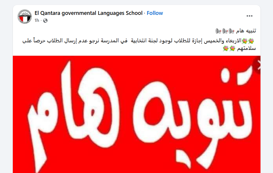 أعلنت المدارس المقرر استخداها كلجان انتخابية في إعادة انتخابات مجلس النواب 2025 ، عن تعليق الدراسة غدا الأربعاء وبعد غد الخميس بسبب الانتخابات