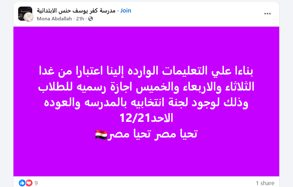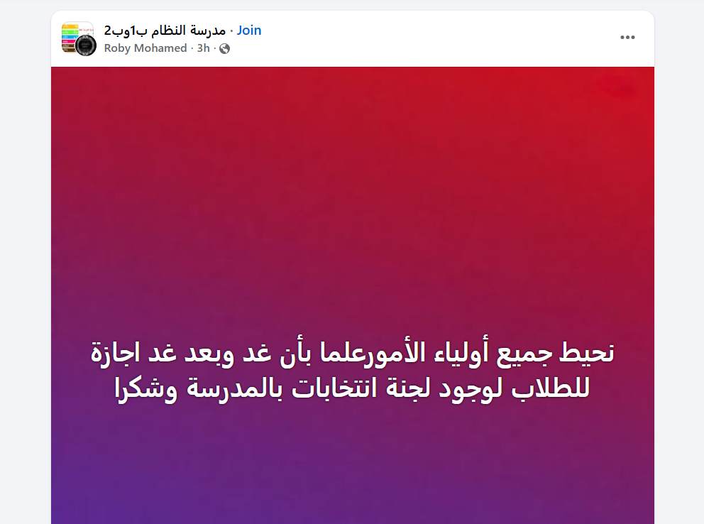 وأوضحت هذه المدارس أن الأربعاء 17 ديسمبر والخميس 18 ديسمبر 2025 اجازة للطلاب بسبب انتخابات مجلس النواب ، مع التشديد على عودة انتظام الدراسة الأسبوع القادم بسكل طبيعي لجميع المراحل التعليمية .