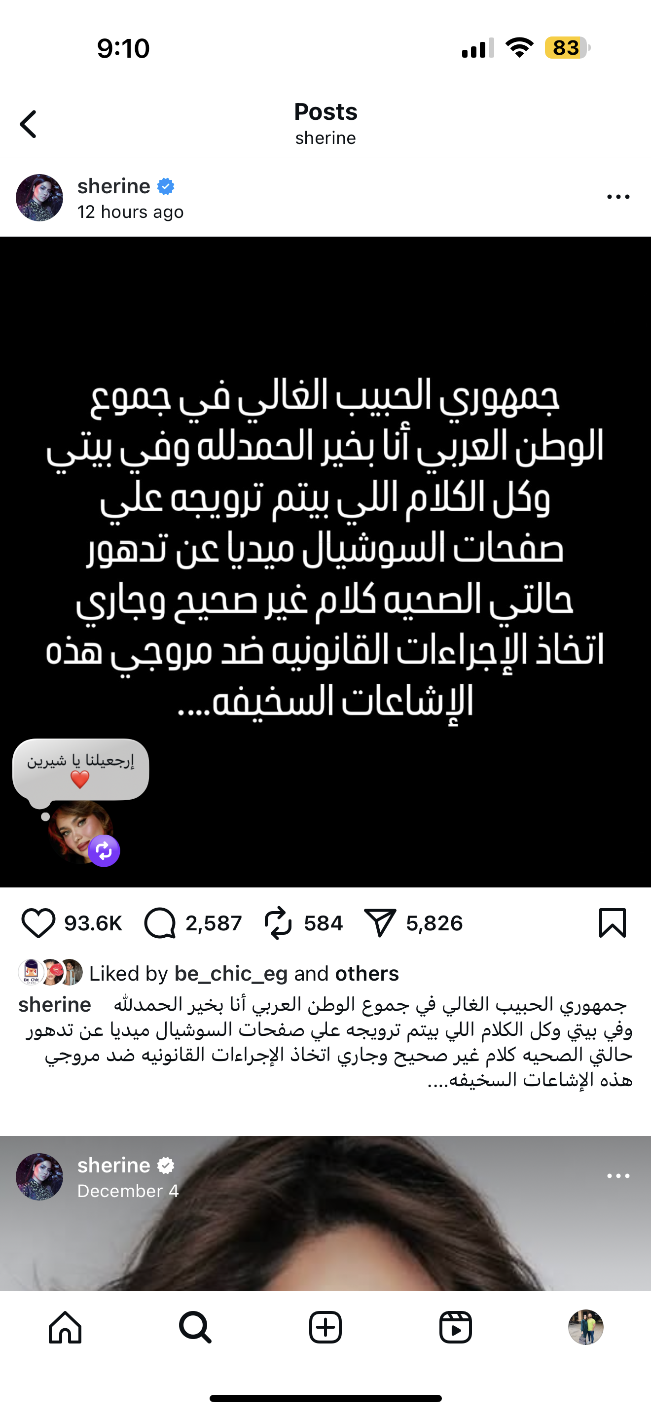 ونشرت شيرين بيانًا عبر حسابها الرسمى على «إنستجرام» قالت فيه: «جمهورى الحبيب الغالى فى جموع الوطن العربى أنا بخير الحمد لله وفى بيتى، وكل الكلام اللى بيتم ترويجه على صفحات السوشيال ميديا عن تدهور حالتى الصحيه كلام غير صحيح».