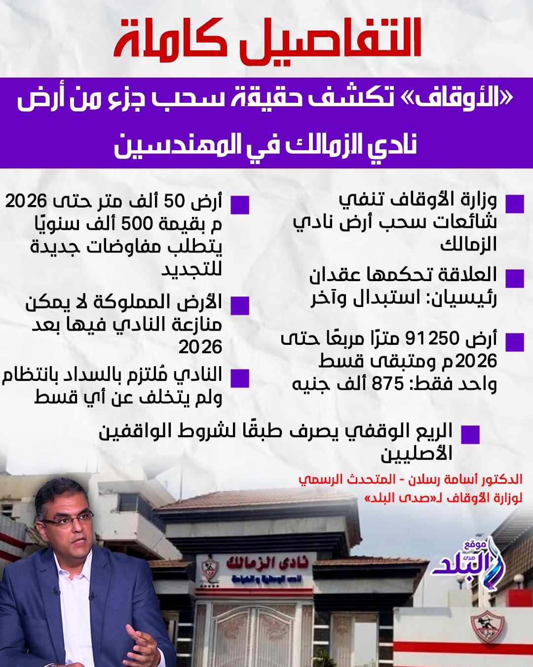 نفى الدكتور أسامة رسلان، المتحدث الرسمي باسم وزارة الأوقاف، سحب جزء من أرض نادي الزمالك في المهندسين أغسطس المقبل، في حال عدم سداد 875 ألف جنيه.