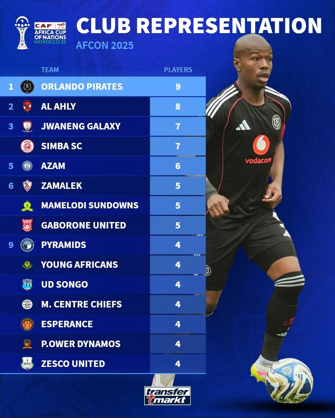 ويتواجد 9 لاعبين من نادي أورلاندو بايرتس ضمن ضمن قوائم المنتخبات المشاركة في بطولة أمم أفريقيا فيما حل النادي الأهلي في المركز الثاني بـ 8 لاعبين .