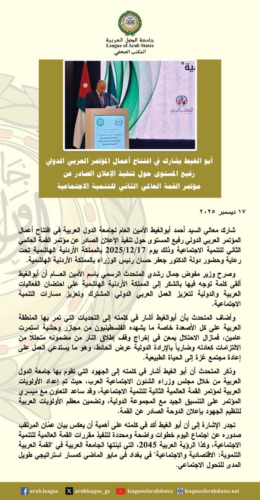وصرح وزير مفوض جمال رشدي، المتحدث الرسمي باسم الأمين العام، أن أبو الغيط ألقى كلمة توجه فيها بالشكر إلى المملكة الأردنية الهاشمية على احتضانها للفعاليات العربية والدولية، معتبراً أن ذلك يعزز العمل العربي المشترك ويعطي دفعة لمسارات التنمية الاجتماعية.