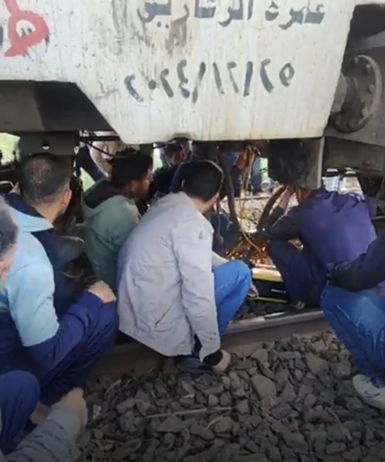 وتجري الأعمال علي قدم وساق لسرعة رفع عربة القطار وأعادة حركة القطارات علي الطريق.
