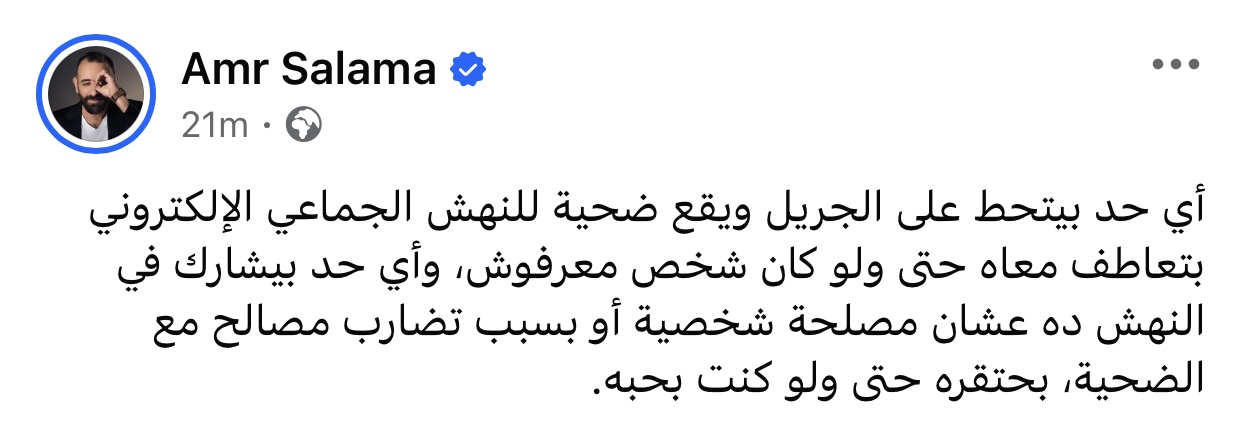 نشر المخرج عمرو سلامة منشور عبر حسابه الشخصي بموقع فيسبوك: “أي حد بيتحط على الجريل ويقع ضحية للنهش الجماعي الإلكتروني بتعاطف معاه حتى ولو كان شخص معرفوش، وأي حد بيشارك في النهش ده عشان مصلحة شخصية أو بسبب تضارب مصالح مع الضحية، بحتقره حتى ولو كنت بحبه”.