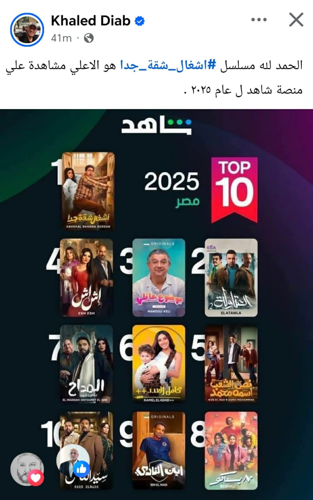 حيث إحتل مسلسله أشغال شقة جدا للمخرج خالد دياب المركز الأول في قائمة الأعمال الأكثر مشاهدة في عام 2025.