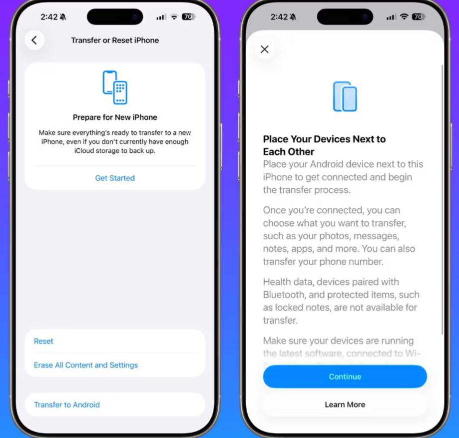 وسيتمكن المستخدمون من وضع هاتفين من نوع آيفون وأندرويد جنبا إلى جنب، ثم اختيار البيانات التي يرغبون في نقلها، مثل جهات الاتصال، الرسائل، الملاحظات، الصور، التطبيقات، وحتى أرقام الهواتف.