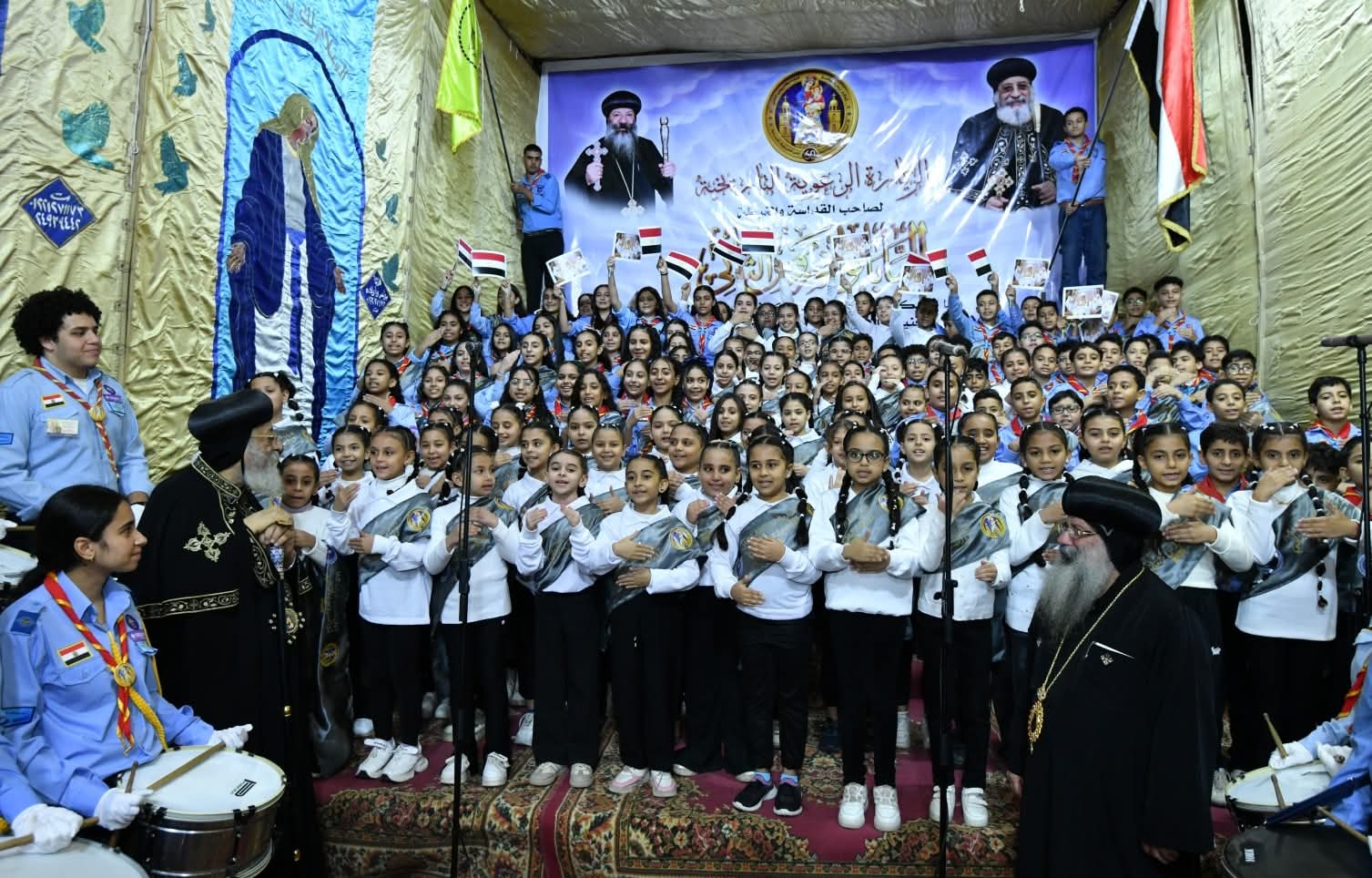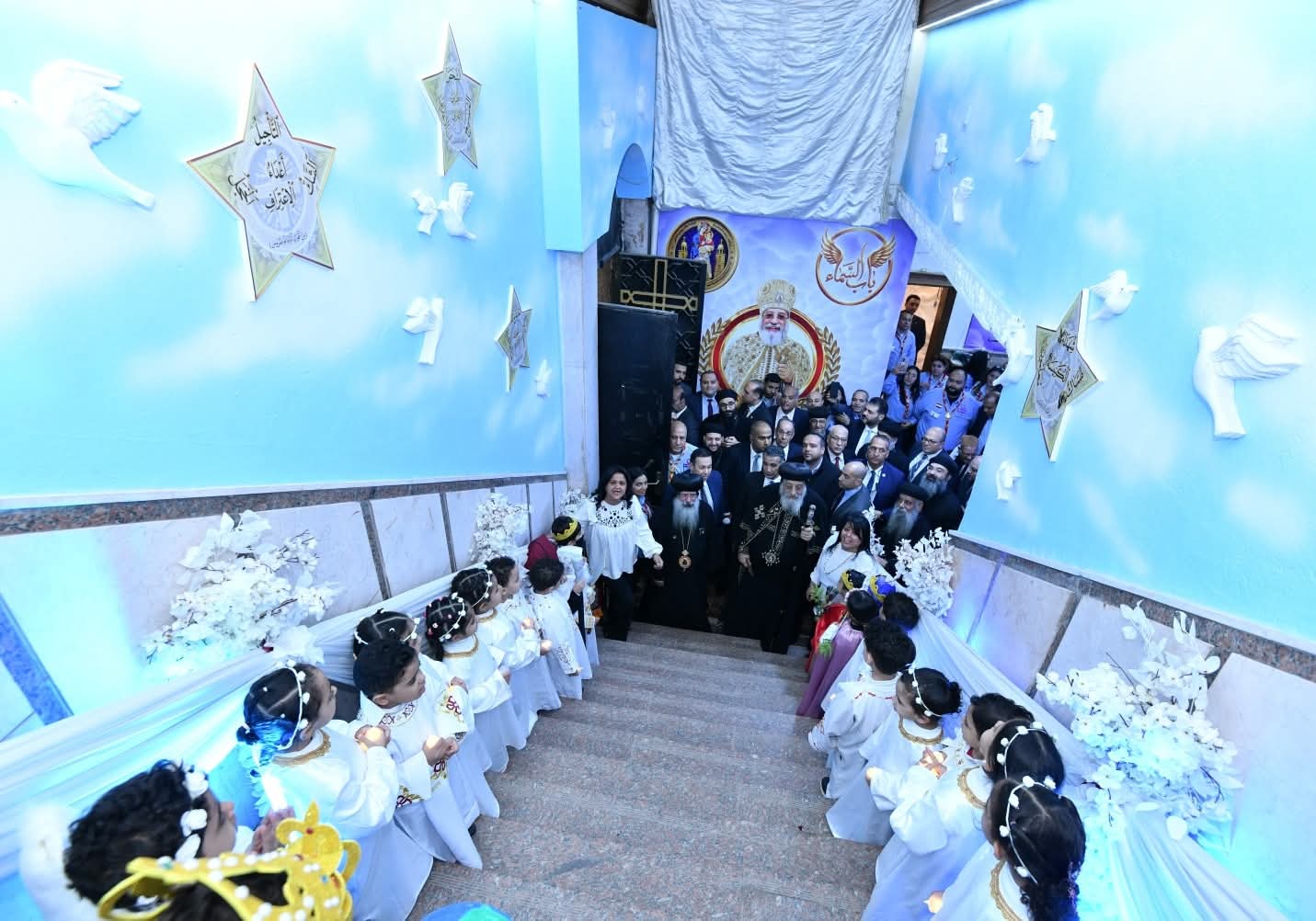واصطف أطفال فصل "حضانة" على السلم المؤدي إلى الكنيسة، وهم يحملون باقات الزهور ويرتلون ترتيلة ترحيبية بأبيهم وحرص قداسته على محاورتهم بود وحب تعبيرًا عن اهتمامه بأولاده وتشجيعه إياهم.