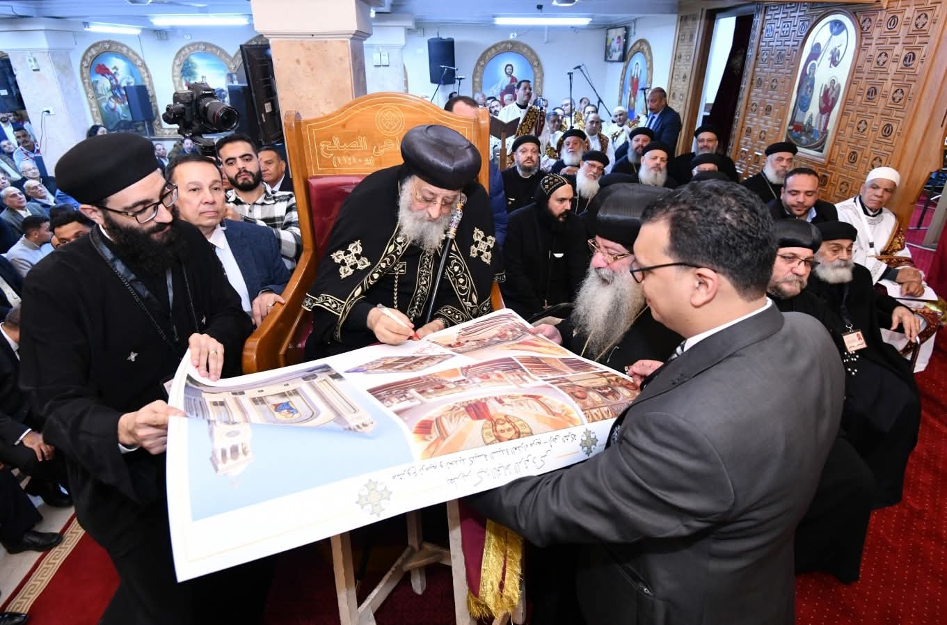 ولدى وصوله تفقد قداسة البابا معرض دار الكتاب المقدس في السرادق المقام خارج الكنيسة، واستقبلت فرق الكشافة قداسته حيث رتلوا بعض الترانيم، ثم أزاح قداسة البابا الستار عن اللوحة التذكارية التي تؤرخ للزيارة والتقطت له صورًا تذكارية مع نيافة الأنبا مارتيروس الأسقف العام لقطاع كنائس شرق السكة الحديد، وكهنة الكنيسة ومجلسها وخدامها.