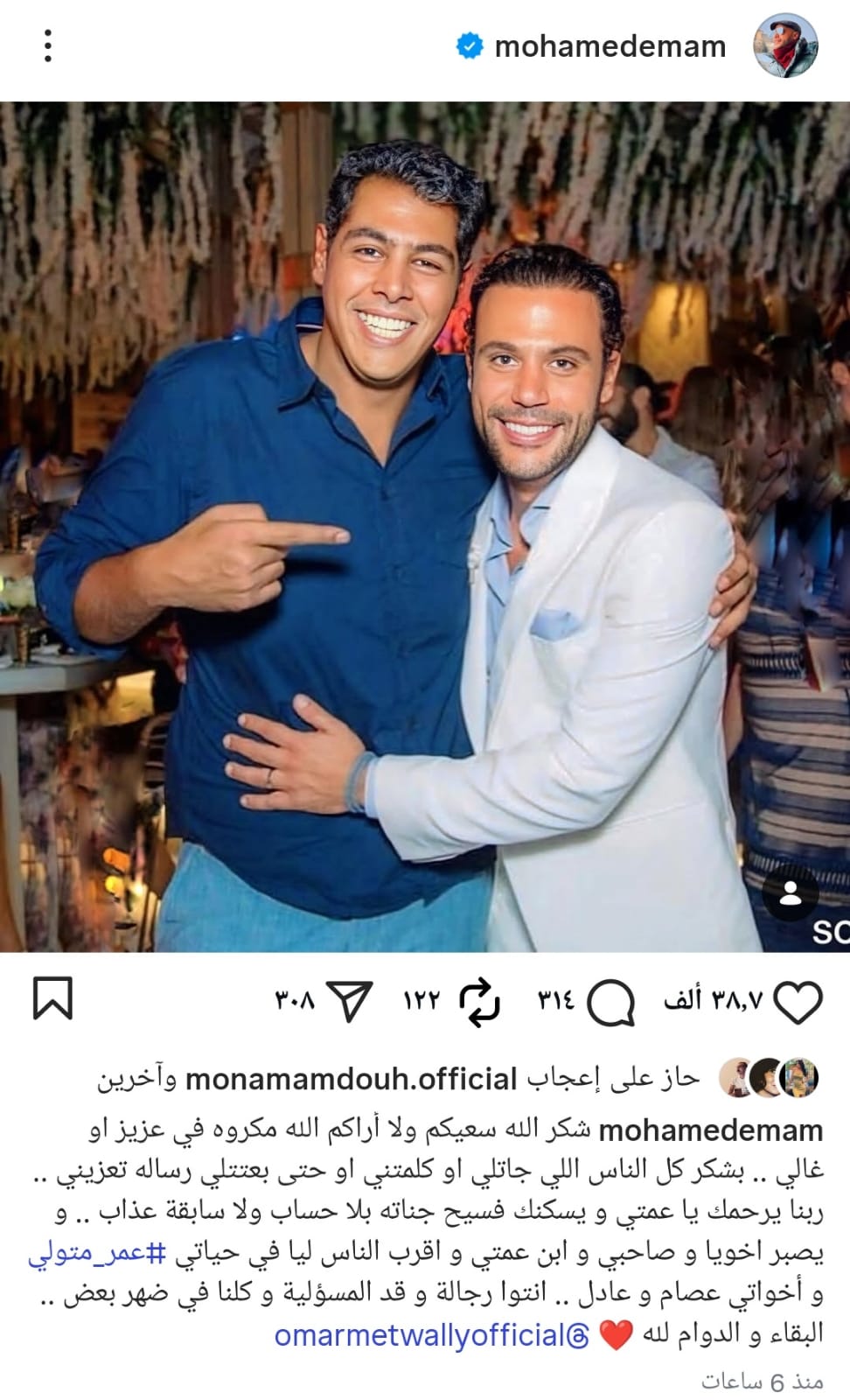 وقال محمد إمام عبر حسابه الرسمي على فيسبوك: «بشكر كل الناس اللي جاتلي أو كلمتني أو حتى بعتتلي رسالة تعزيني. ربنا يرحمك يا عمتي ويسكنك فسيح جناته، ويصبر أخويا وصاحبي وابن عمتي وأقرب الناس ليا في حياتي عمر متولي وأخواتي عصام وعادل».