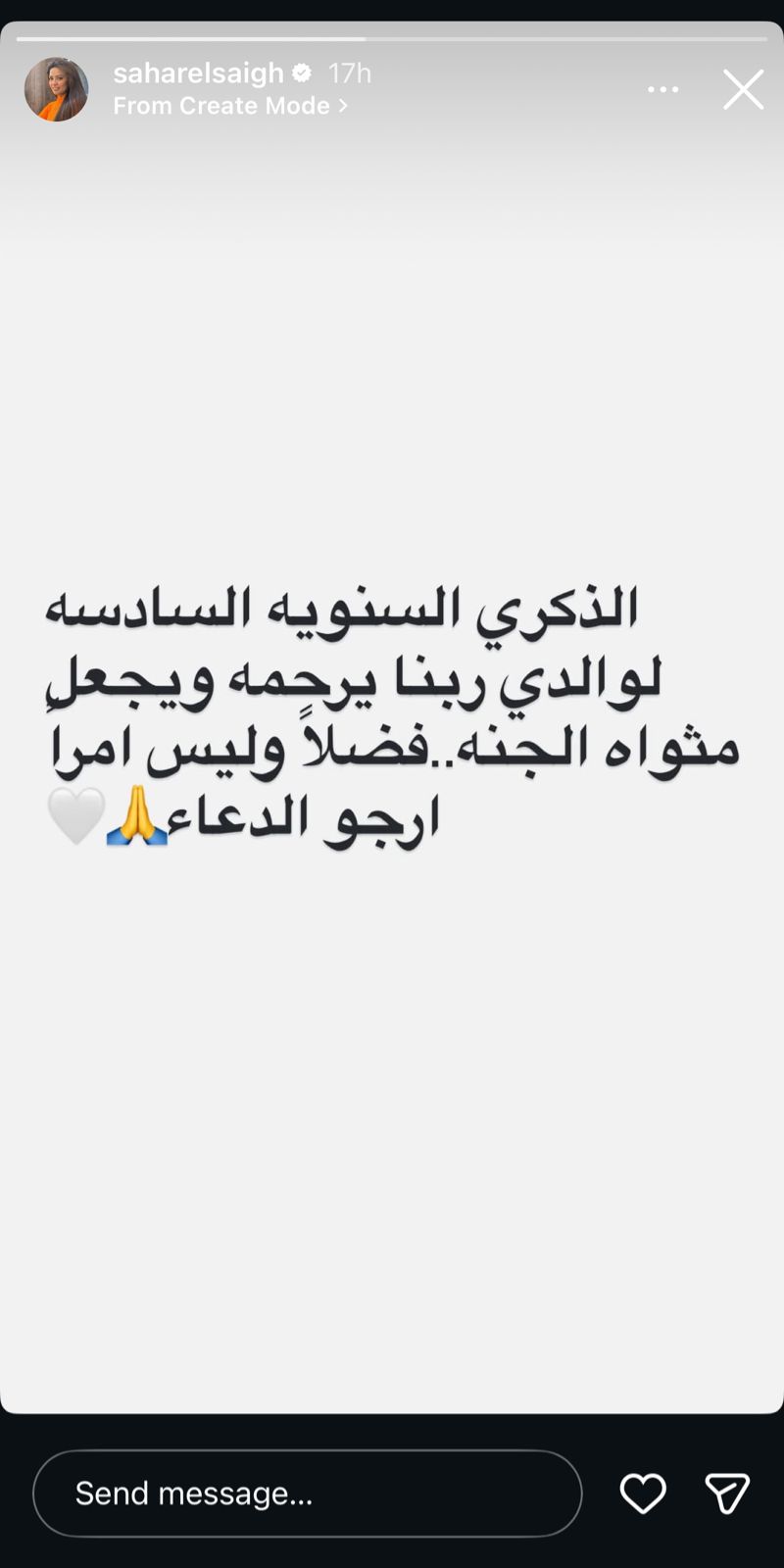 وكتبت سهر الصايغ عبر خاصية الاستوري: “ربنا يرحمه ويجعل مثواه الجنة فضلا وليس أمرا ارجو الدعاء”.