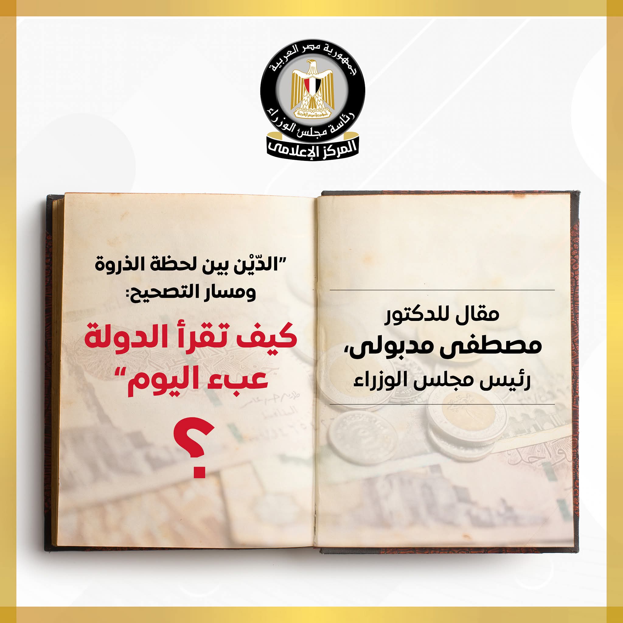 نشرت الصفحة الرسمية لرئاسة مجلس الوزراء علي موقع التواصل الاجتماعي فيس بوك مقال لدكتور مصطفى مدبولى رئيس مجلس الوزراء تحت عنوان "الدّيْن بين لحظة الذروة ومسار التصحيح: كيف تقرأ الدولة عبء اليوم؟".