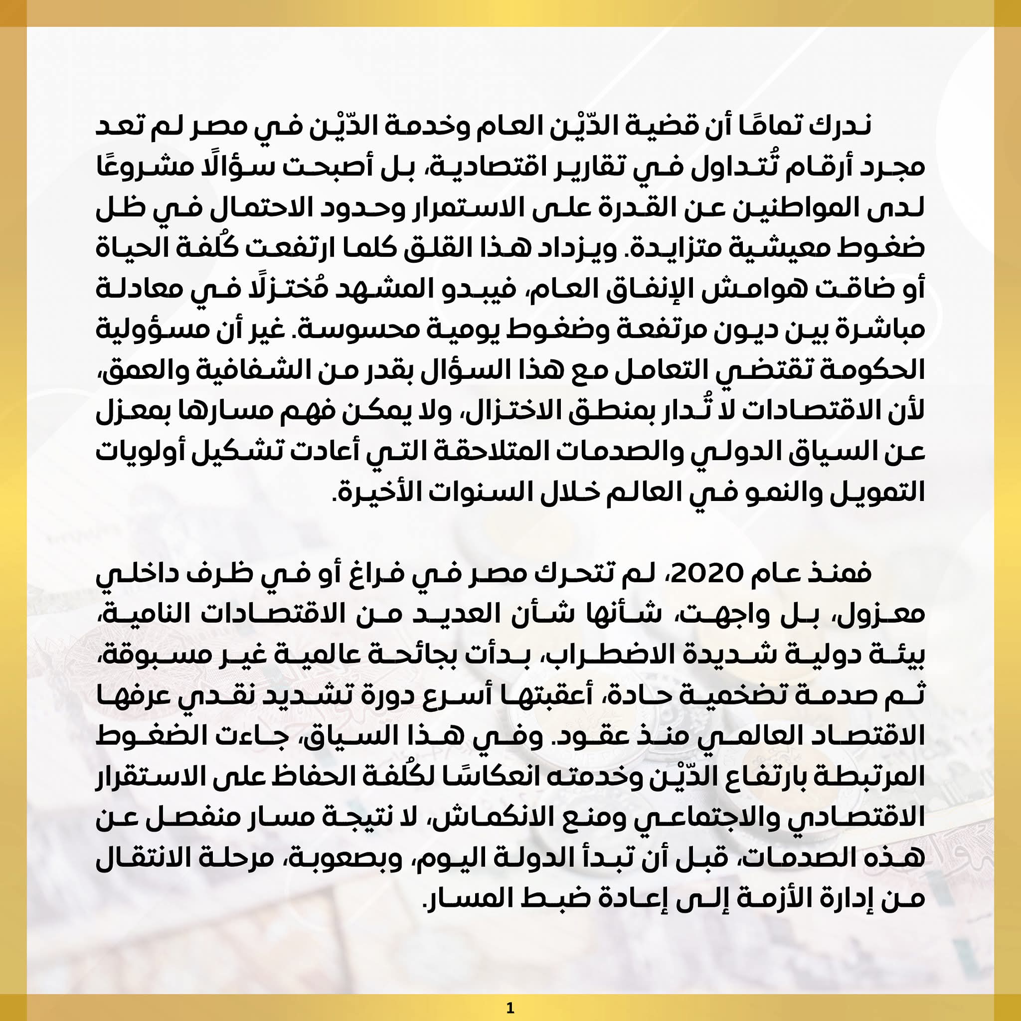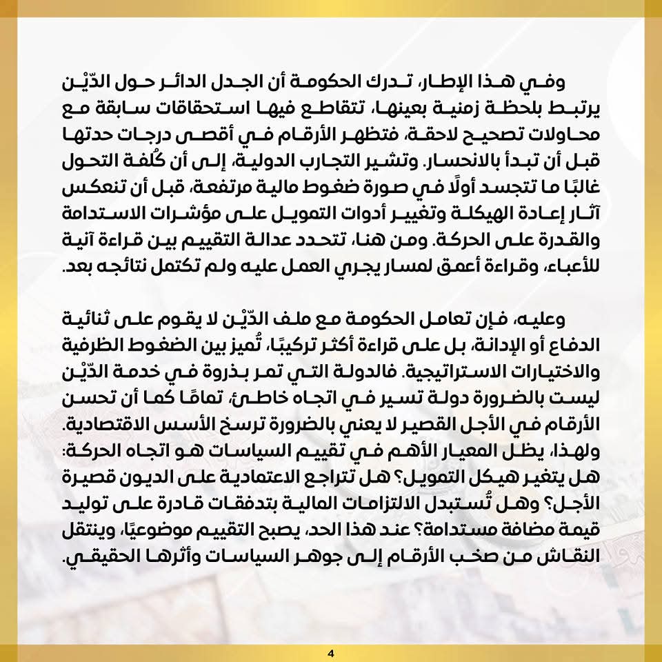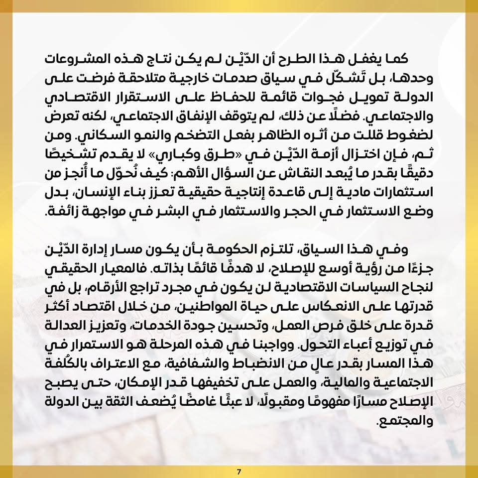 وفي هذا السياق، تلتزم الحكومة بأن يكون مسار إدارة الدّيْن جزءًا من رؤية أوسع للإصلاح، لا هدفًا قائمًا بذاته. فالمعيار الحقيقي لنجاح السياسات الاقتصادية لن يكون في مجرد تراجع الأرقام، بل في قدرتها على الانعكاس على حياة المواطنين، من خلال اقتصاد أكثر قدرة على خلق فرص العمل، وتحسين جودة الخدمات، وتعزيز العدالة في توزيع أعباء التحول. وواجبنا في هذه المرحلة هو الاستمرار في هذا المسار بقدر عالٍ من الانضباط والشفافية، مع الاعتراف بالكُلفة الاجتماعية والمالية، والعمل على تخفيفها قدر الإمكان، حتى يصبح الإصلاح مسارًا مفهومًا ومقبولًا، لا عبئًا غامضًا يُضعف الثقة بين الدولة والمجتمع.