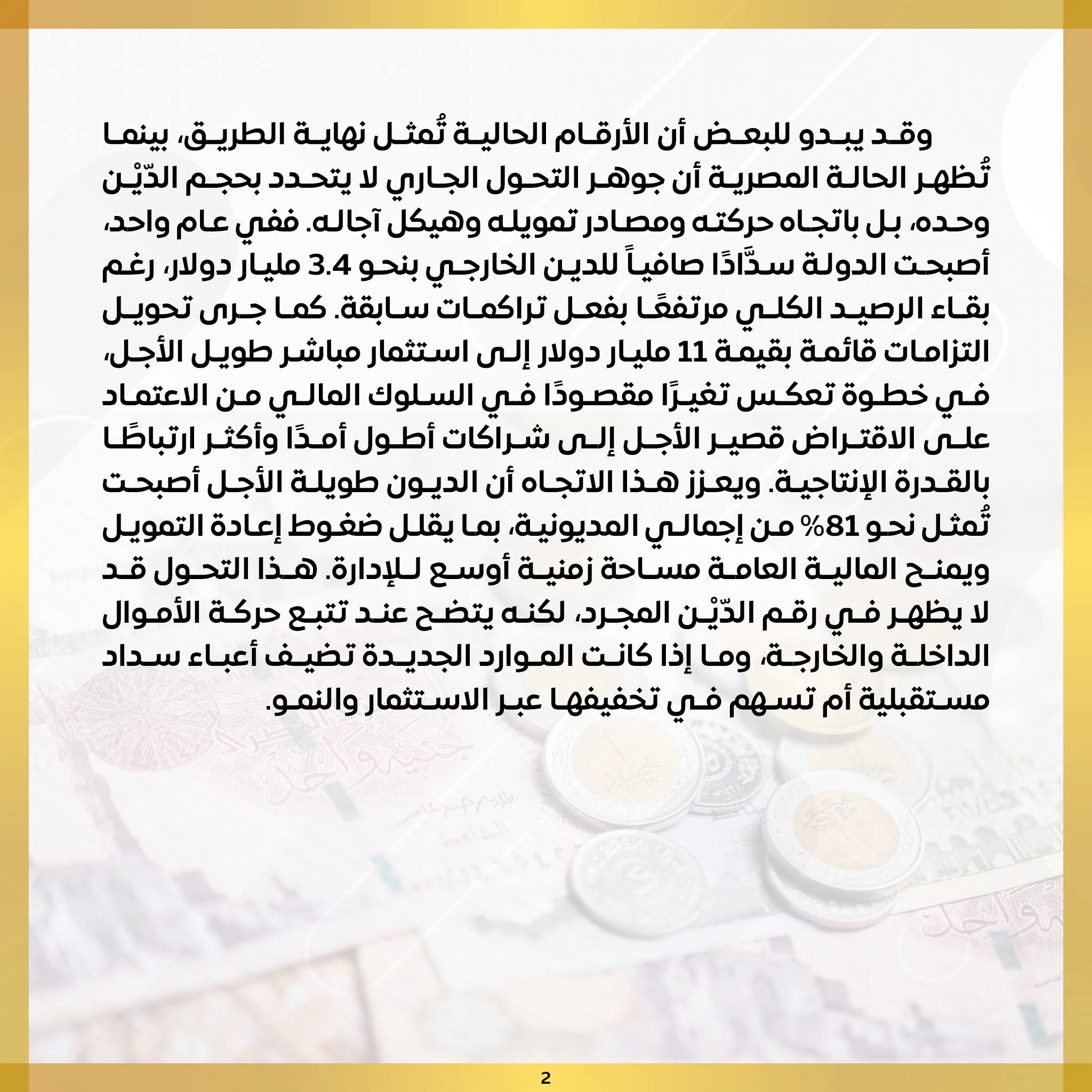 وعليه، فإن تعامل الحكومة مع ملف الدّيْن لا يقوم على ثنائية الدفاع أو الإدانة، بل على قراءة أكثر تركيبًا، تُميز بين الضغوط الظرفية والاختيارات الاستراتيجية. فالدولة التي تمر بذروة في خدمة الدّيْن ليست بالضرورة دولة تسير في اتجاه خاطئ، تمامًا كما أن تحسن الأرقام في الأجل القصير لا يعني بالضرورة ترسخ الأسس الاقتصادية. ولهذا، يظل المعيار الأهم في تقييم السياسات هو اتجاه الحركة: هل يتغير هيكل التمويل؟ هل تتراجع الاعتمادية على الديون قصيرة الأجل؟ وهل تُستبدل الالتزامات المالية بتدفقات قادرة على توليد قيمة مضافة مستدامة؟ عند هذا الحد، يصبح التقييم موضوعيًا، وينتقل النقاش من صخب الأرقام إلى جوهر السياسات وأثرها الحقيقي.