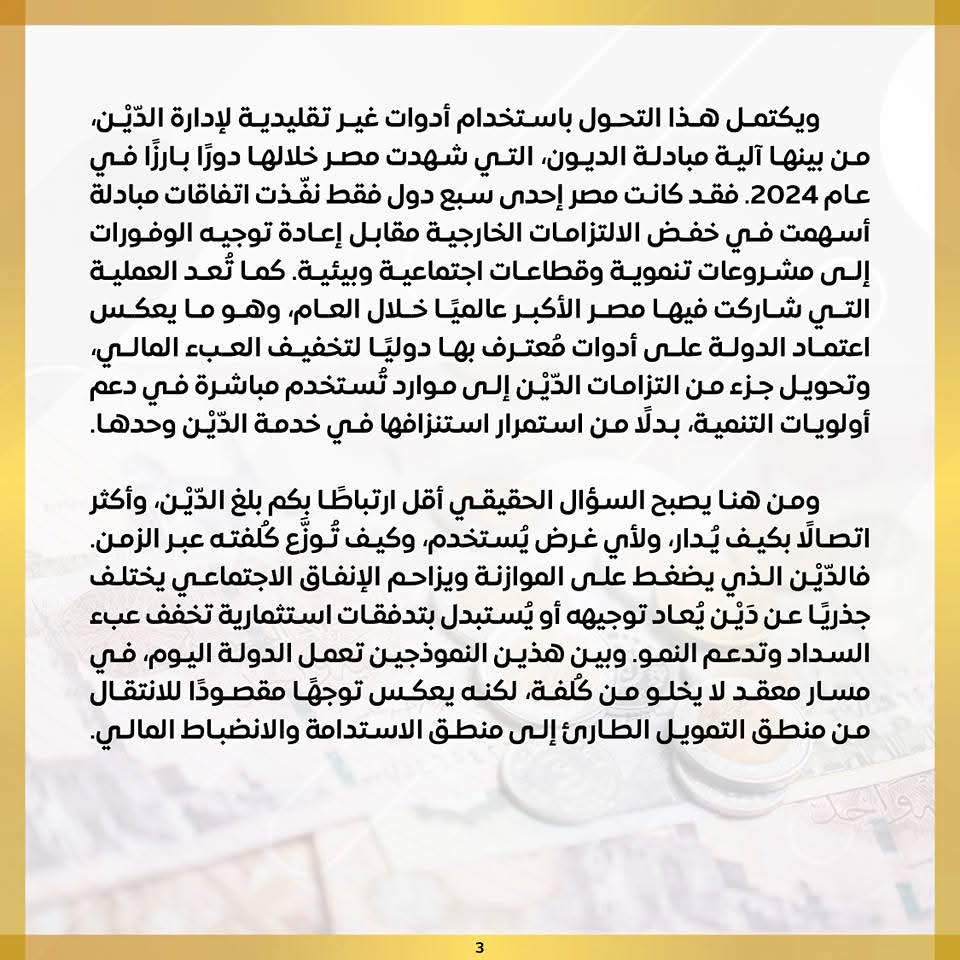 ويكتمل هذا التحول باستخدام أدوات غير تقليدية لإدارة الدّيْن، من بينها آلية مبادلة الديون، التي شهدت مصر خلالها دورًا بارزًا في عام 2024. فقد كانت مصر إحدى سبع دول فقط نفّذت اتفاقات مبادلة أسهمت في خفض الالتزامات الخارجية مقابل إعادة توجيه الوفورات إلى مشروعات تنموية وقطاعات اجتماعية وبيئية. كما تُعد العملية التي شاركت فيها مصر الأكبر عالميًا خلال العام، وهو ما يعكس اعتماد الدولة على أدوات مُعترف بها دوليًا لتخفيف العبء المالي، وتحويل جزء من التزامات الدّيْن إلى موارد تُستخدم مباشرة في دعم أولويات التنمية، بدلًا من استمرار استنزافها في خدمة الدّيْن وحدها.