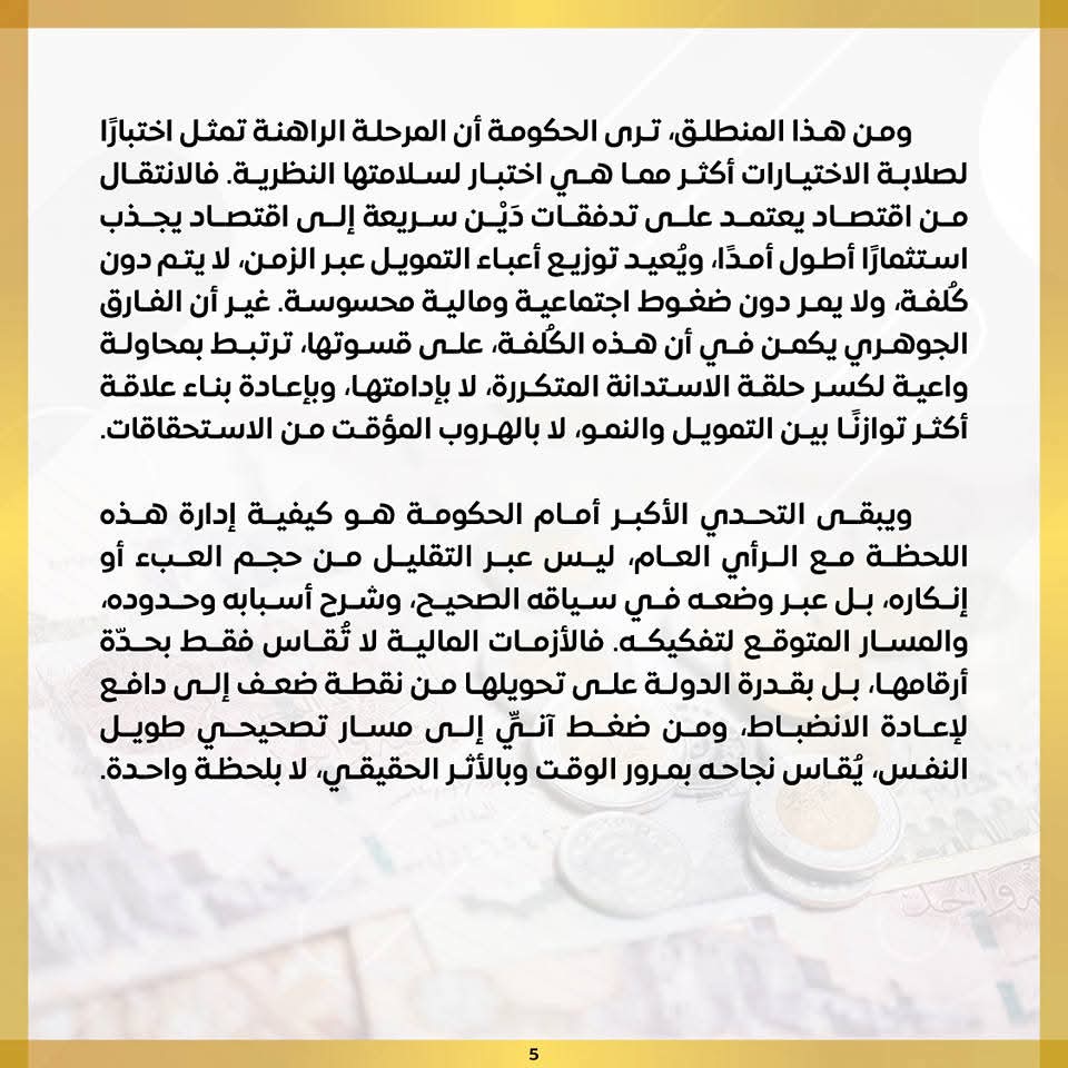 ويبقى التحدي الأكبر أمام الحكومة هو كيفية إدارة هذه اللحظة مع الرأي العام، ليس عبر التقليل من حجم العبء أو إنكاره، بل عبر وضعه في سياقه الصحيح، وشرح أسبابه وحدوده، والمسار المتوقع لتفكيكه. فالأزمات المالية لا تُقاس فقط بحدّة أرقامها، بل بقدرة الدولة على تحويلها من نقطة ضعف إلى دافع لإعادة الانضباط، ومن ضغط آنيِّ إلى مسار تصحيحي طويل النفس، يُقاس نجاحه بمرور الوقت وبالأثر الحقيقي، لا بلحظة واحدة.