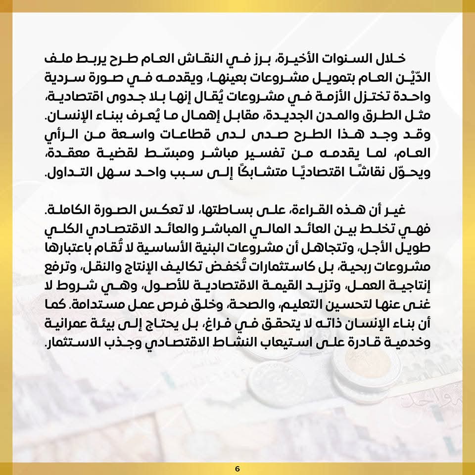 كما يغفل هذا الطرح أن الدّيْن لم يكن نتاج هذه المشروعات وحدها، بل تَشكّل في سياق صدمات خارجية متلاحقة فرضت على الدولة تمويل فجوات قائمة للحفاظ على الاستقرار الاقتصادي والاجتماعي. فضلًا عن ذلك، لم يتوقف الإنفاق الاجتماعي، لكنه تعرض لضغوط قللت من أثره الظاهر بفعل التضخم والنمو السكاني. ومن ثم، فإن اختزال أزمة الدّيْن في «طرق وكباري» لا يقدم تشخيصًا دقيقًا بقدر ما يُبعد النقاش عن السؤال الأهم: كيف نُحوّل ما أُنجز من استثمارات مادية إلى قاعدة إنتاجية حقيقية تعزز بناء الإنسان، بدل وضع الاستثمار في الحجر والاستثمار في البشر في مواجهة زائفة.