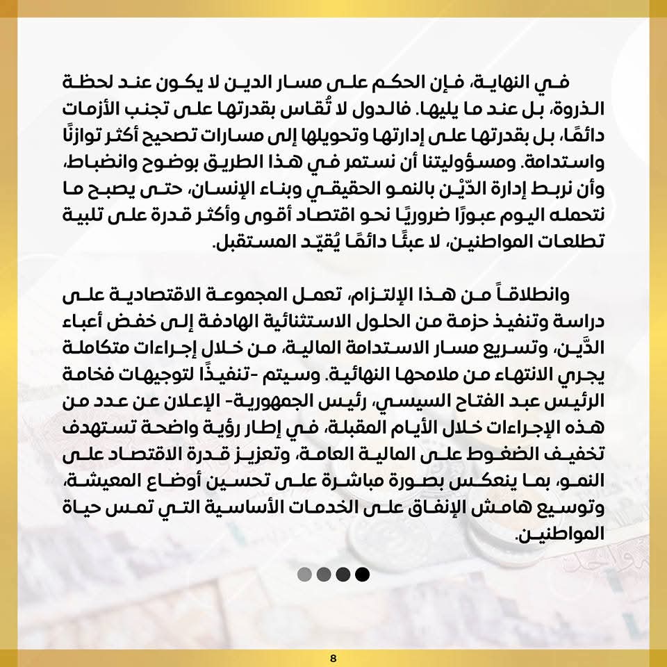 وانطلاقاً من هذا الإلتزام، تعمل المجموعة الاقتصادية على دراسة وتنفيذ حزمة من الحلول الاستثنائية الهادفة إلى خفض أعباء الدّين، وتسريع مسار الاستدامة المالية، من خلال إجراءات متكاملة يجري الانتهاء من ملامحها النهائية. وسيتم- تنفيذا لتوجيهات فخامة الرئيس عبدالفتاح السيسي، رئيس الجمهورية- الإعلان عن عدد من هذه الإجراءات خلال الأيام المقبلة، في إطار رؤية واضحة تستهدف تخفيف الضغوط على المالية العامة، وتعزيز قدرة الاقتصاد على النمو، بما ينعكس بصورة مباشرة على تحسين أوضاع المعيشة، وتوسيع هامش الإنفاق على الخدمات الأساسية التي تمس حياة المواطنين.