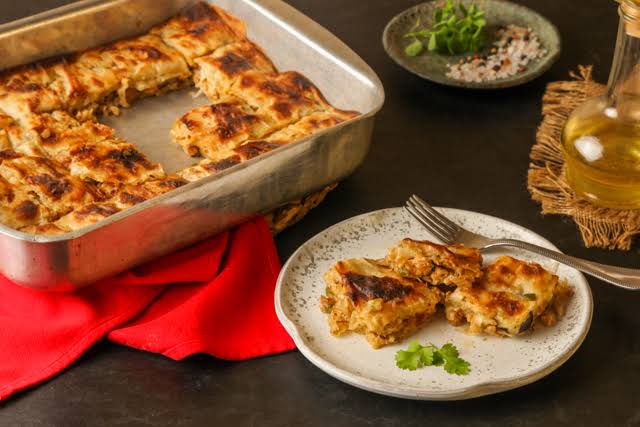 ـ تُفرد ورقتان من الجلاش، وتُدهن بخليط الزبدة والزيت.