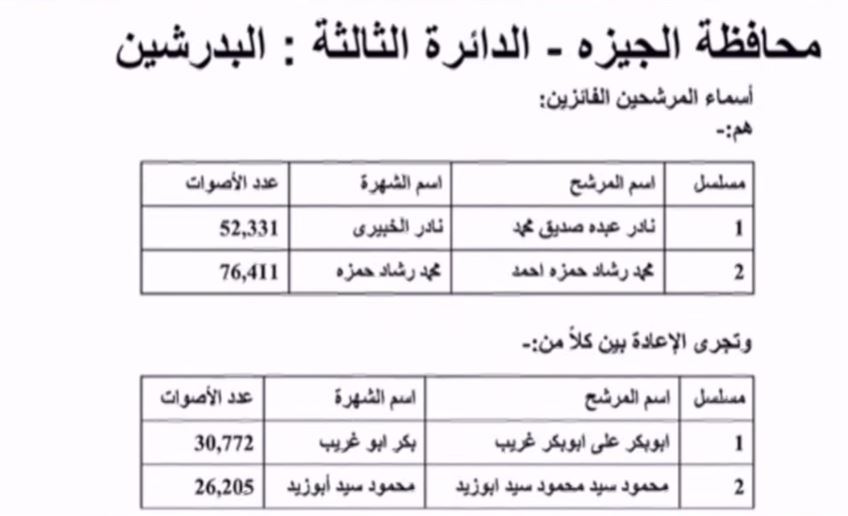 أكد المستشار حازم بدوى فوز مرشحين وإعادة بين اثنين آخرين بالدائرة الثالثة البدرشين