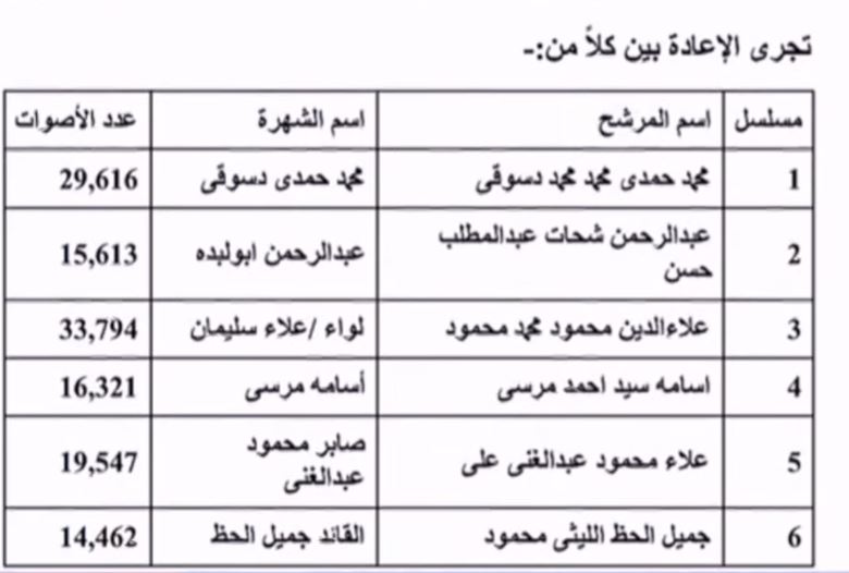 وفوز مرشح وإعادة بين 6 آخرين بالدائرة الثانية عشر منشأة القناطر وفوز مرشح وإعادة بين اثنين آخرين بالدائرة العاشرة قسم أول أكتوبر وإعادة بين 4 مرشحين بالدائرة التاسعة قسم الأهرام وإعادة بين 4 مرشحين بالدائرة السابعة العمرانية وفوز مرشحين وإعادة بين اثنين آخرين بالدائرة السادسة بولاق الدكرور وفوز مرشحين وإعادة بين اثنين آخرين بالدائرة الثالثة البدرشين.
