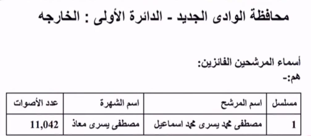 أكد المستشار حازم بدوى فوز مصطفى يسرى بالدائرة الأولى الخارجة بالوادي الجديد وإعادة بين 4 مرشحين بالدائرة الرابعة أبو تيج بأسيوط وإعادة بين 8 مرشحين بالدائرة الثانية القوصية بأسيوط وإعادة بين 6 مرشحين بالدائرة الأولى أول أسسيوط وإعادة بين مرشحين بالدائرة السادسة دير مواس بالمنيا وإعادة بين 6 مرشحين بالدائرة الخامسة ملوي بالمنيا وإعادة بين 4 مرشحين بالدائرة الرابعة أبو قرقاص بالمنيا وإعادة بين 8 مرشحين بالدائرة الثالثة مغاغة بالمنيا وإعادة بين 6 آخرين بالدائرة الأولى قسم أول المنيا وإعادة بين 6 آخرين بالدائرة الثالثة سنورس بالفيوم وفوز مرشح وإعادة بين 6 آخرين بالدائرة الثانية عشر منشأة القناطر وفوز مرشح وإعادة بين اثنين آخرين بالدائرة العاشرة قسم أول أكتوبر وإعادة بين 4 مرشحين بالدائرة التاسعة قسم الأهرام وإعادة بين 4 مرشحين بالدائرة السابعة العمرانية وفوز مرشحين وإعادة بين اثنين آخرين بالدائرة السادسة بولاق الدكرور وفوز مرشحين وإعادة بين اثنين آخرين بالدائرة الثالثة البدرشين