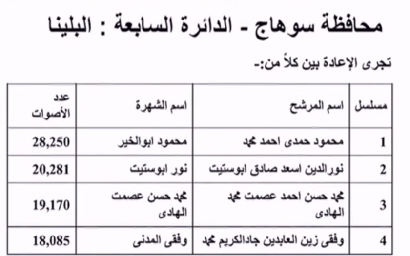 أكد المستشار حازم بدوى إعادة بين اثنين مرشحين بالدائرة الثانية الداخلة بالوادي الجديد وفوز مصطفى يسرى بالدائرة الأولى الخارجة بالوادي الجديد وإعادة بين 4 مرشحين بالدائرة الرابعة أبو تيج بأسيوط وإعادة بين 8 مرشحين بالدائرة الثانية القوصية بأسيوط وإعادة بين 6 مرشحين بالدائرة الأولى أول أسيوط وإعادة بين مرشحين بالدائرة السادسة دير مواس بالمنيا وإعادة بين 6 مرشحين بالدائرة الخامسة ملوي بالمنيا وإعادة بين 4 مرشحين بالدائرة الرابعة أبو قرقاص بالمنيا وإعادة بين 8 مرشحين بالدائرة الثالثة مغاغة بالمنيا وإعادة بين 6 آخرين بالدائرة الأولى قسم أول المنيا وإعادة بين 6 آخرين بالدائرة الثالثة سنورس بالفيوم وفوز مرشح وإعادة بين 6 آخرين بالدائرة الثانية عشرة منشأة القناطر وفوز مرشح وإعادة بين اثنين آخرين بالدائرة العاشرة قسم أول أكتوبر وإعادة بين 4 مرشحين بالدائرة التاسعة قسم الأهرام وإعادة بين 4 مرشحين بالدائرة السابعة العمرانية وفوز مرشحين وإعادة بين اثنين آخرين بالدائرة السادسة بولاق الدكرور وفوز مرشحين وإعادة بين اثنين آخرين بالدائرة الثالثة البدرشين.