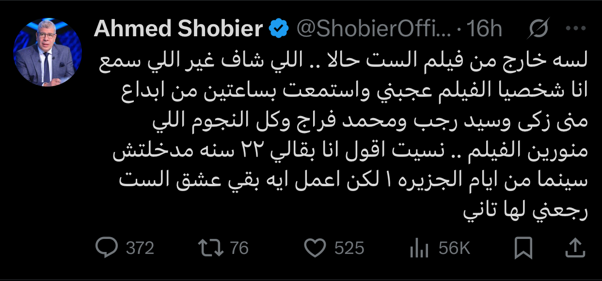 وكتب شوبير عبر حسابه الشخصي على منصة إكس: “لسه خارج من فيلم الست حالا .. اللي شاف غير اللي سمع انا شخصيا الفيلم عجبني واستمعت بساعتين من ابداع منى زكى وسيد رجب ومحمد فراج وكل النجوم اللي منورين الفيلم .. نسيت اقول انا بقالي ٢٢ سنه مدخلتش سينما من ايام الجزيرة لكن اعمل ايه بقي عشق الست رجعني لها تاني”.