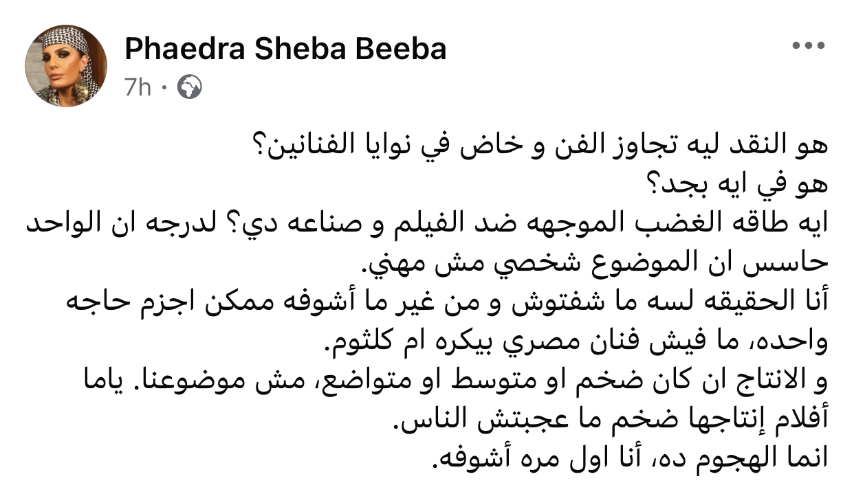 وكتبت فيدرا عبر حسابها الشخصي بموقع فيسبوك: “هو النقد ليه تجاوز الفن وخاض في نوايا الفنانين؟ هو في إيه بجد؟”.