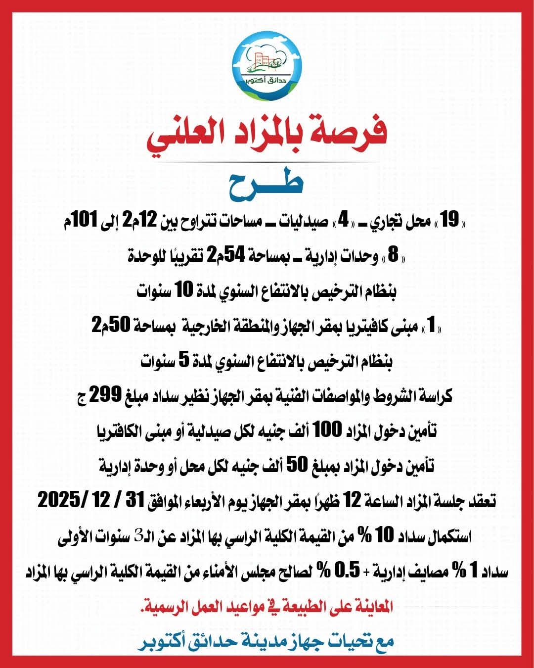 وأشار المهندس ياسر عبد الحليم رئيس جهاز المدينة إلى أن جلسة المزاد تعقد الساعة الـ12 ظهرًا بمقر الجهاز يوم الأربعاء الموافق 31 / 12 /2025، ويتم استكمال سداد 10% من القيمة الكلية الراسي بها المزاد عن الـ3 سنوات الأولى كتأمين نهائي سارٍ طوال مدة العقد مع مراعاة تجديد التأمين قبل بداية المدة المتبقية من العقد