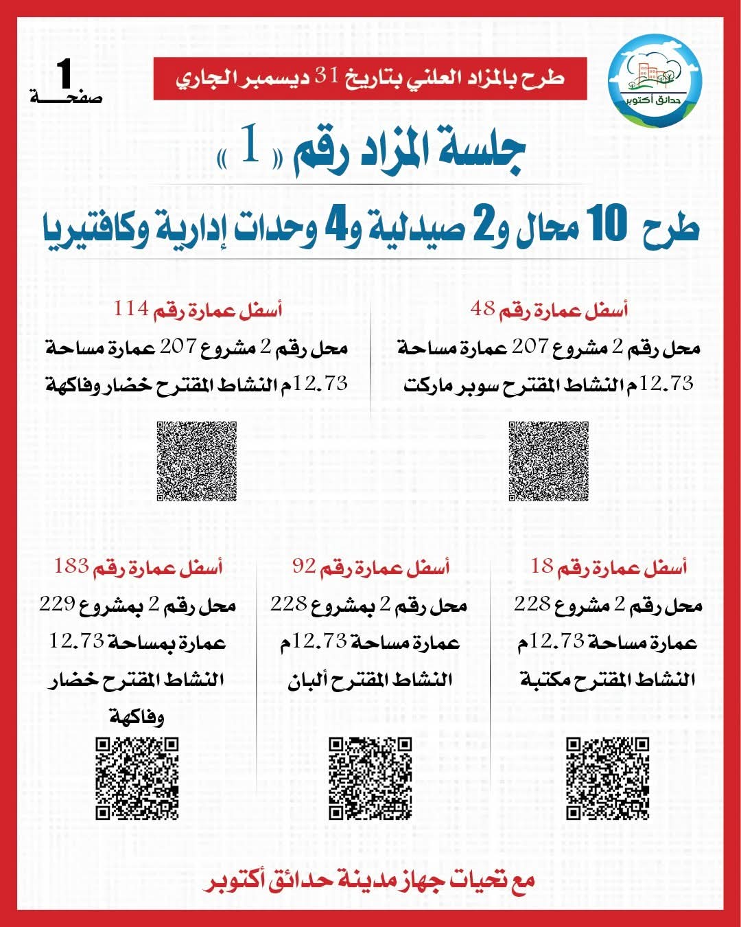 اعلن جهاز مدينة حدائق أكتوبر عن طرح (19) محلا تجاريا و(4) صيدليات بمساحات تتراوح بين 12م2 إلى 101م2 و( وحدات إدارية بمساحة 54م2 تقريبًا للوحدة، بالأسواق التجارية وأسفل العمارات بأماكن متفرقة بالمدينة؛ وذلك بنظام الترخيص بالانتفاع السنوي لمدة 10 سنوات بالمدينة بالمزاد العلني. وطرح مبنى الكافيتريا بمقر الجهاز والمنطقة الخارجية بمساحة 50م2 بالمدينة، وذلك بنظام الترخيص بالانتفاع السنوي لمدة 5 سنوات بالمدينة.