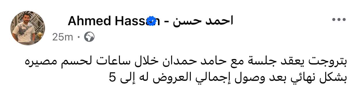 وكتب أحمد حسن عبر حسابه الشخصي بموقع فيسبوك: "بتروجت يعقد جلسة مع حامد حمدان خلال ساعات لحسم مصيره بشكل نهائي بعد وصول إجمالي العروض له إلى ٥".