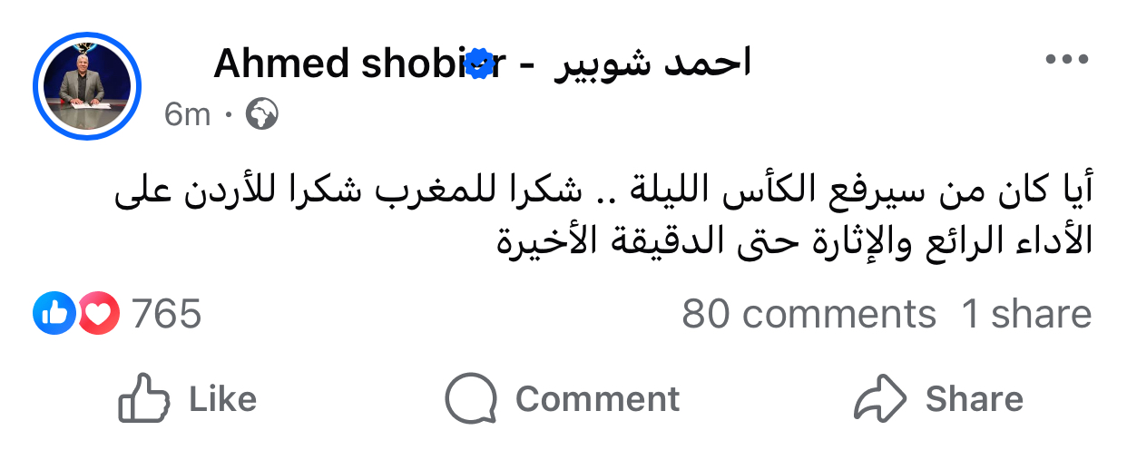وكتب شوبير عبر حسابه الشخصي بموقع فيسبوك: "أيًا كان من سيرفع الكأس الليلة، شكرًا للمغرب شكرًا للأردن على الأداء الرائع والإثارة حتى الدقيقة الأخيرة ".