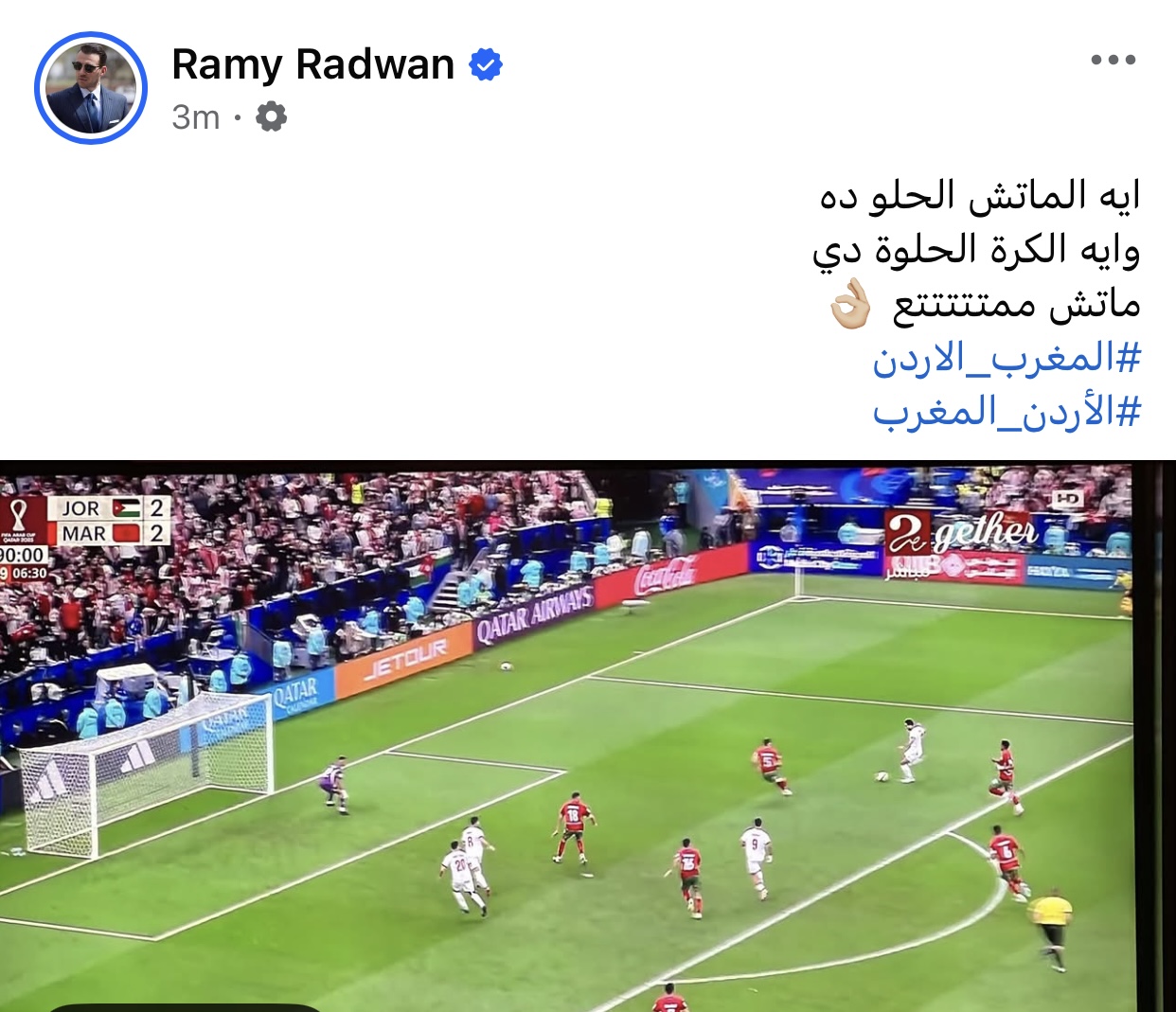 أشاد الإعلامي رامي رضوان، بالمباراة التي جمعت بين المنتخب المغربي ونظيره الأردني، التي أقيمت على ملعب لوسيل بالعاصمة القطرية الدوحة.