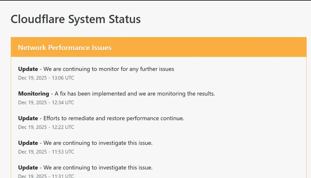 تم الإبلاغ عن حدوث مشاكل في أداء شبكة Cloudflare في الساعات الأولى من صباح اليوم. وقد أصدرت الشركة بيانا تفيد بأنها كانت تراقب المشكلة، وتم تطبيق إصلاح لها منذ حوالي ساعة.