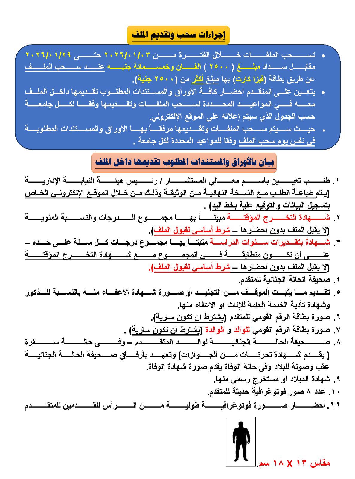 يبدأ سحب وتقديم ملفات التعيين في وظيفة معاون نيابة إدارية من 3 وحتى 29 يناير 2026، على أن يكون السحب من مقر النيابة الإدارية بمدينة 6 أكتوبر — ميدان النجدة، من الساعة 9 صباحا حتى 2:30 ظهرا.