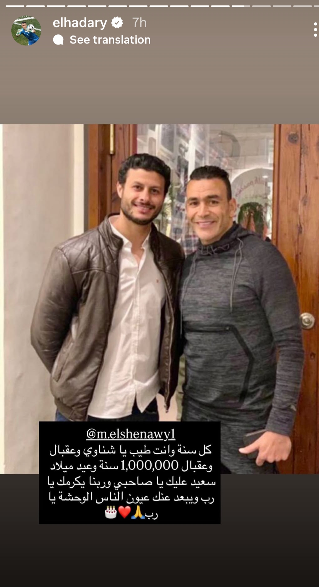 ونشر الحضري صورة تجمعه مع الشناوي عبر حسابه على “إنستجرام”، وكتب: “كل سنة وأنت طيب يا شناوي، وعقبال 1,000,000 سنة، وعيد ميلاد سعيد عليك يا صاحبي، وربنا يكرمك يا رب ويبعد عنك عيون الناس الوحشة يا رب”.