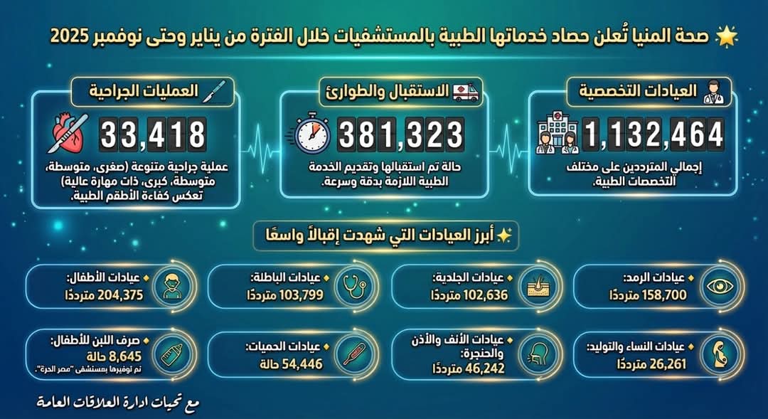 اعلنت مديرية الصحة بالمنيا، أن المنشآت الصحية شهدت تطورًا ملحوظًا في مختلف الأقسام الطبية، حيث تم إجراء 33,418 عملية جراحية بالمستشفيات خلال الفترة من يناير حتى نوفمبر 2025، تنوعت بين العمليات الصغرى والمتوسطة والكبرى، إضافة إلى العمليات ذات المهارة العالية، مما يعكس كفاءة استعداد وكفاءة الأطقم الطبية المتخصصة، وذلك في إطار توجيهات الدكتور خالد عبد الغفار وزير الصحة والسكان، ومتابعة اللواء الوزير عماد كدواني محافظ المنيا، والدكتور محمود عمر عبد الوهاب وكيل وزارة الصحة بالمنيا، والدكتور مروة إسماعيل وكيلة المديرية.