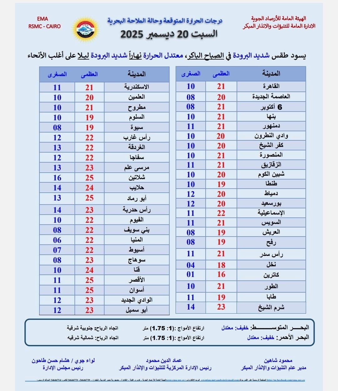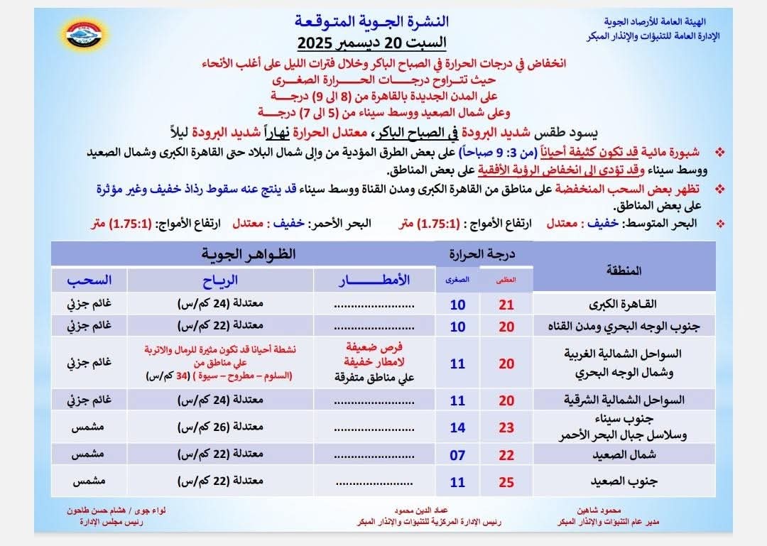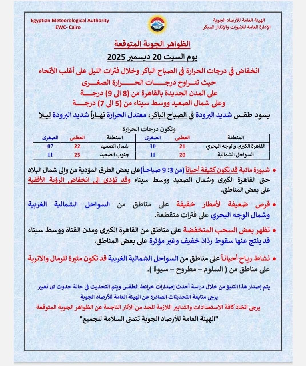 الظواهر الجوية المتوقعة اليوم السبت 20 ديسمبر 2025