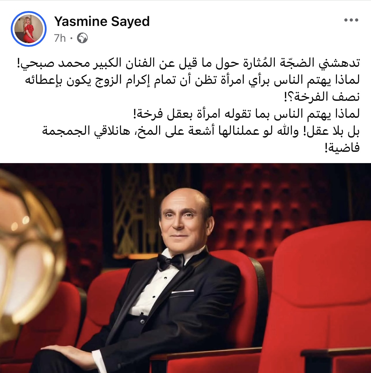 وكتبت ياسمين الخطيب عبر حسابها الشخصي بموقع فيسبوك: “تدهشني الضجّة المُثارة حول ما قيل عن الفنان الكبير محمد صبحي”.