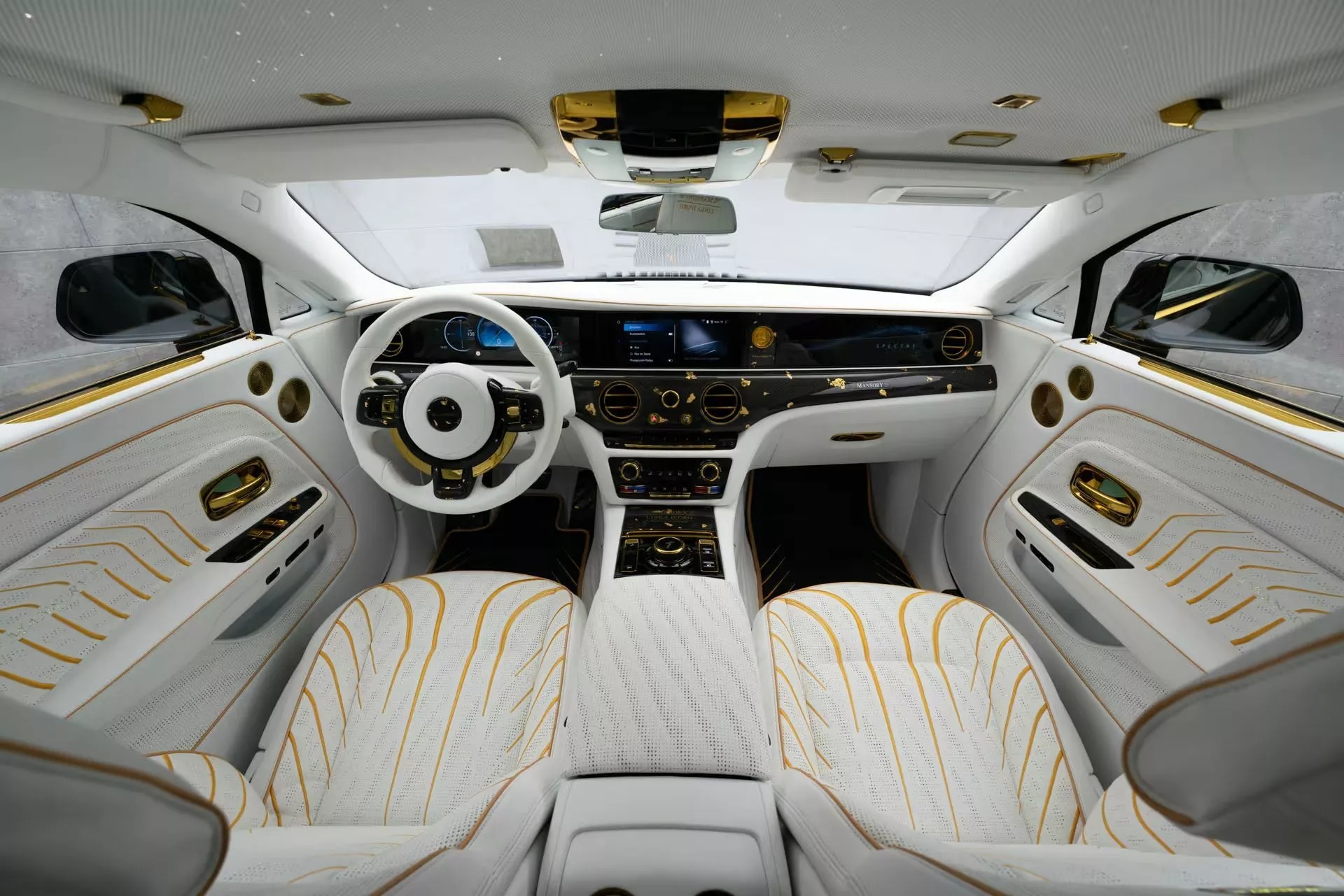 تكشف مقصورة السيارة عن مستوى عالٍ من العناية بالتفاصيل، حيث جاءت المقاعد بجلد أبيض فاخر، مع تطريزات دقيقة وحواف ذهبية واضحة، وتمتد اللمسات الفاخرة إلى فرش الأرضيات المصمم خصيصًا، إلى جانب تطعيمات ذهبية موزعة بعناية على مختلف أجزاء المقصورة، كما حصلت عجلة القيادة على تصميم عصري يتماشى مع هوية السيارة، مع الاحتفاظ بالشاشات القياسية التي تميز رولز رويس سبيكتر.