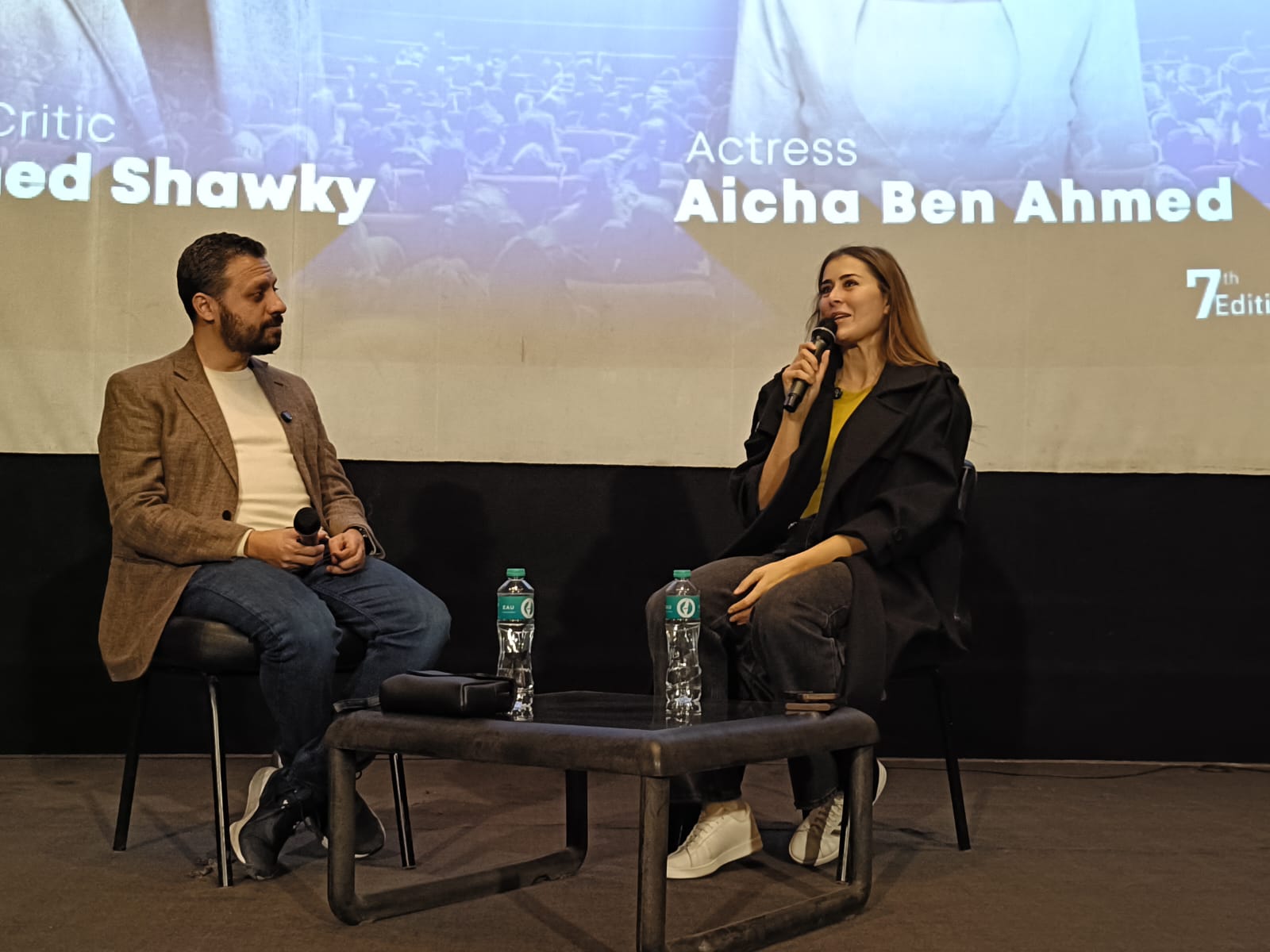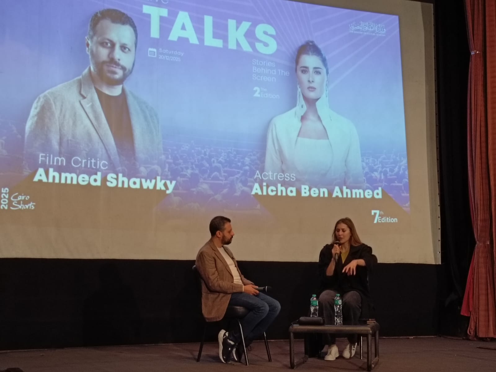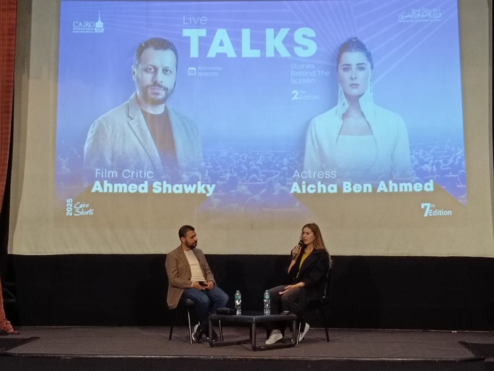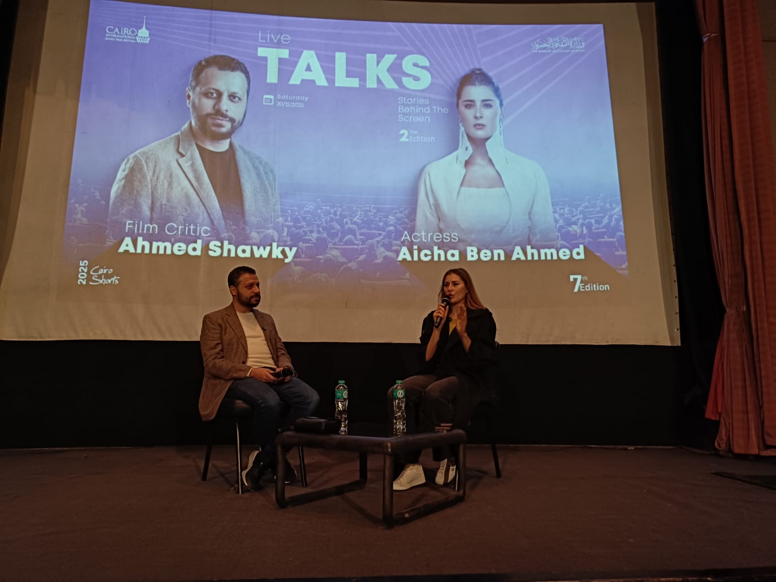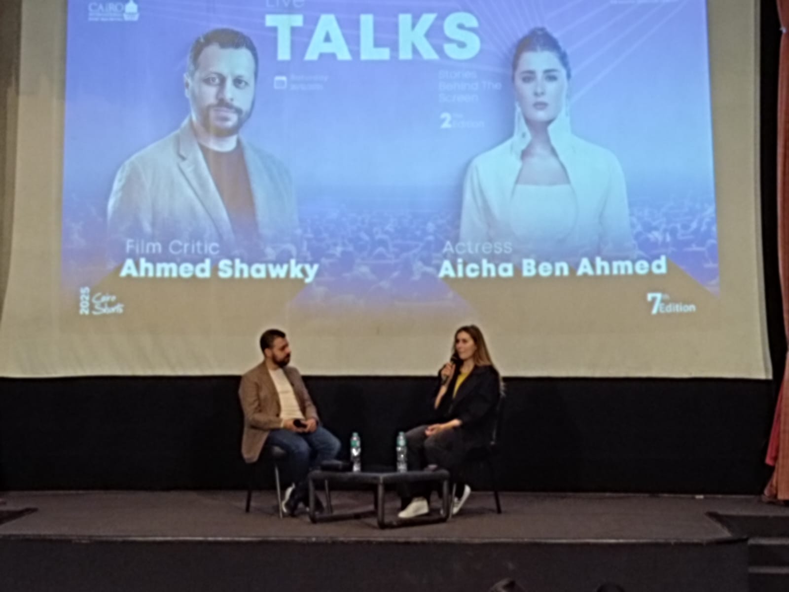 ضمن فعاليات الدورة السابعة من مهرجان القاهرة الدولي للفيلم القصير، استضاف مركز الإبداع الفني بدار الأوبرا المصرية حوارا مفتوحا جمع النجمة التونسية عائشة بن أحمد مع الناقد السينمائي أحمد شوقي، في لقاء إنساني وفني كشفت خلاله عن محطات مهمة في مسيرتها، وتفاصيل شخصية عن رحلتها بين تونس ومصر.